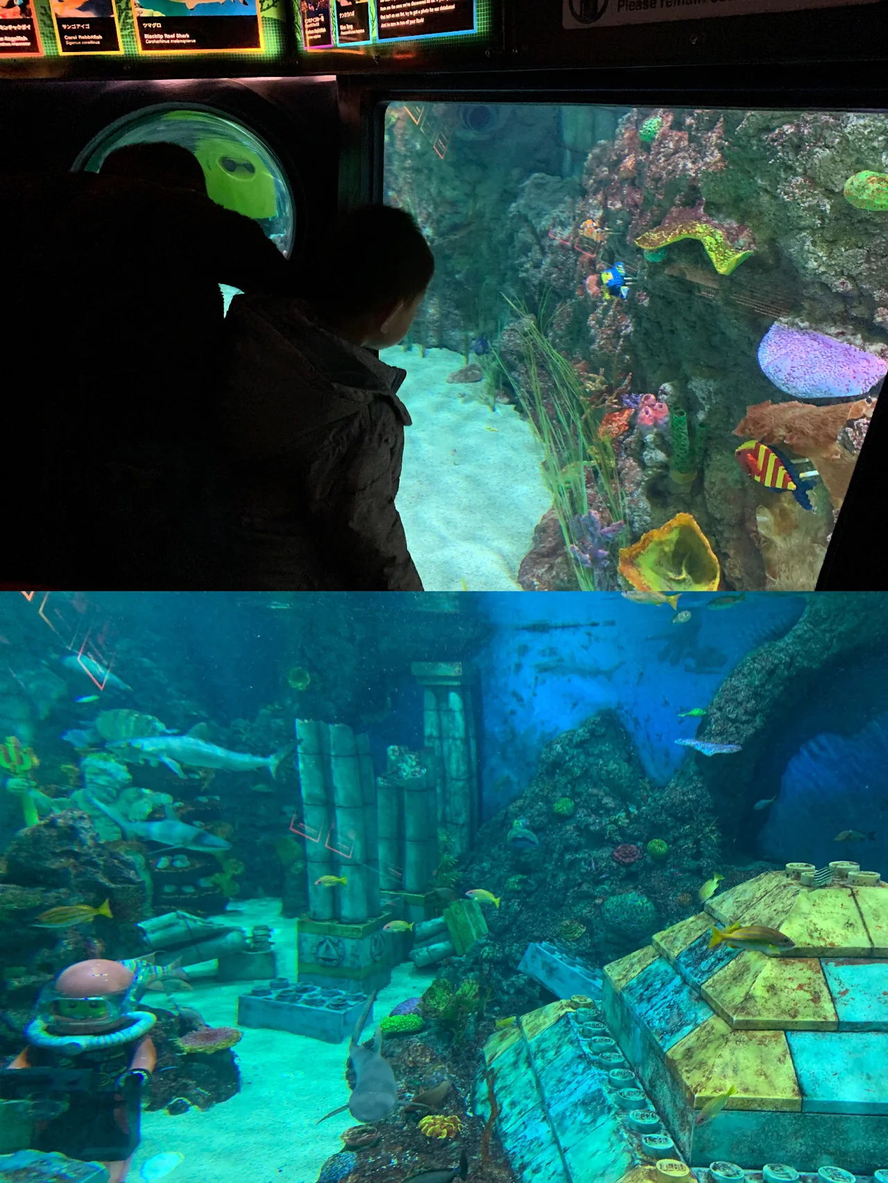 坐潜水艇看海底世界,乐高积木与真实小鱼完美结合,出来后还有几个小小的鱼缸,并提示当日票+1000日元就可以参观Sea Life水族馆。