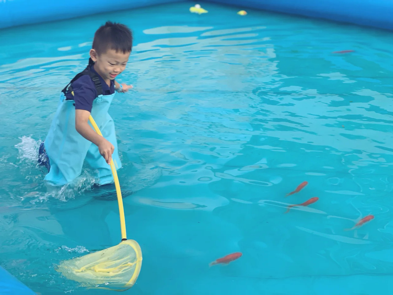 (小蜜蜂农场里的捞鱼是大人和弟弟都能进去的哦)本来以为哥哥只是乱玩玩抓不到鱼的,没想到乱捞八捞居然被他捞到5条鱼!