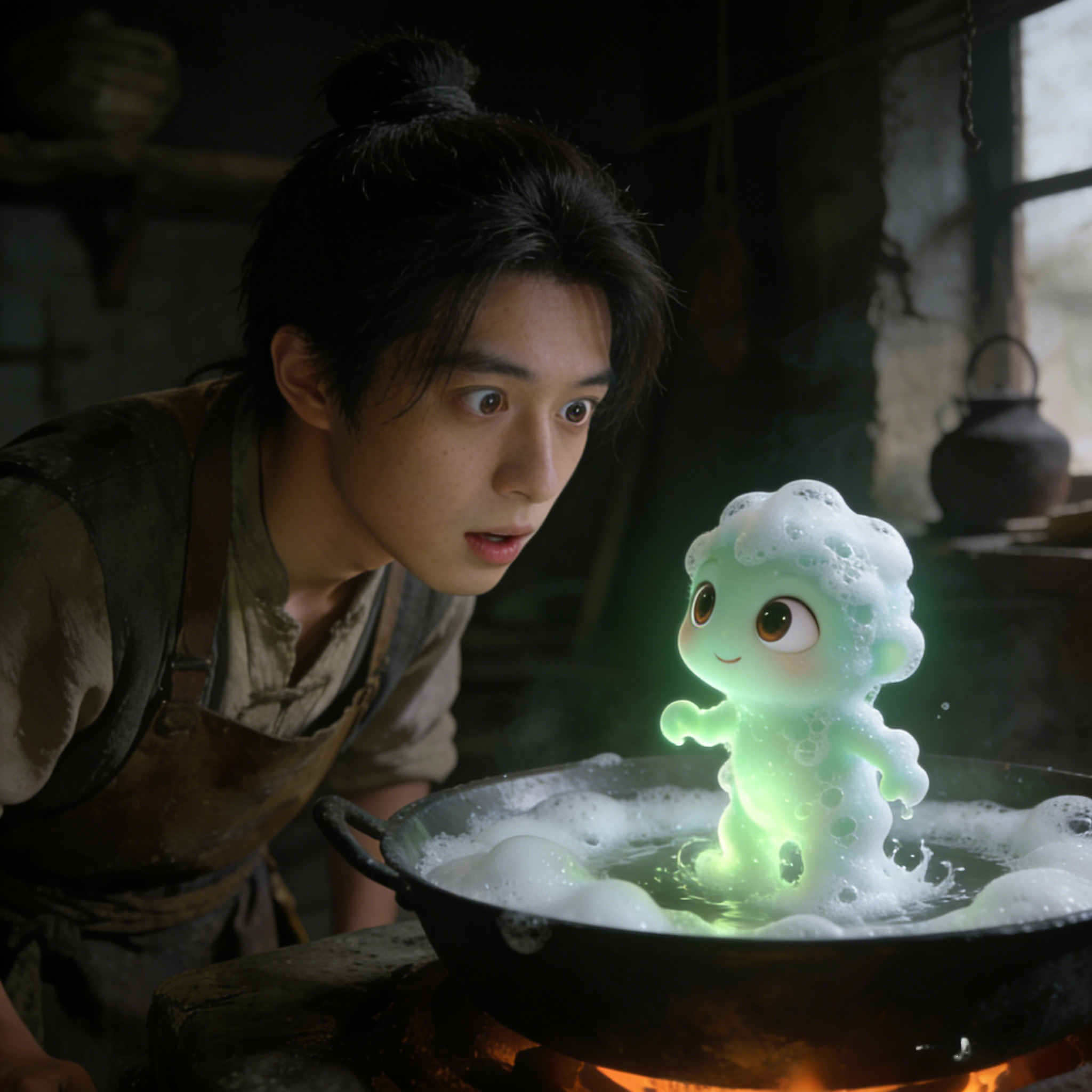 就在他将皂液倒入锅中,准备加入油脂和碱水时,异变突生。锅中的皂液突然泛起一层细密的泡沫,一道微弱的绿色光芒从泡沫中闪过,紧接着,一个只有拇指大小、浑身由皂液凝聚而成的小生灵钻了出来,对着李相亭眨了眨圆溜溜的眼睛。