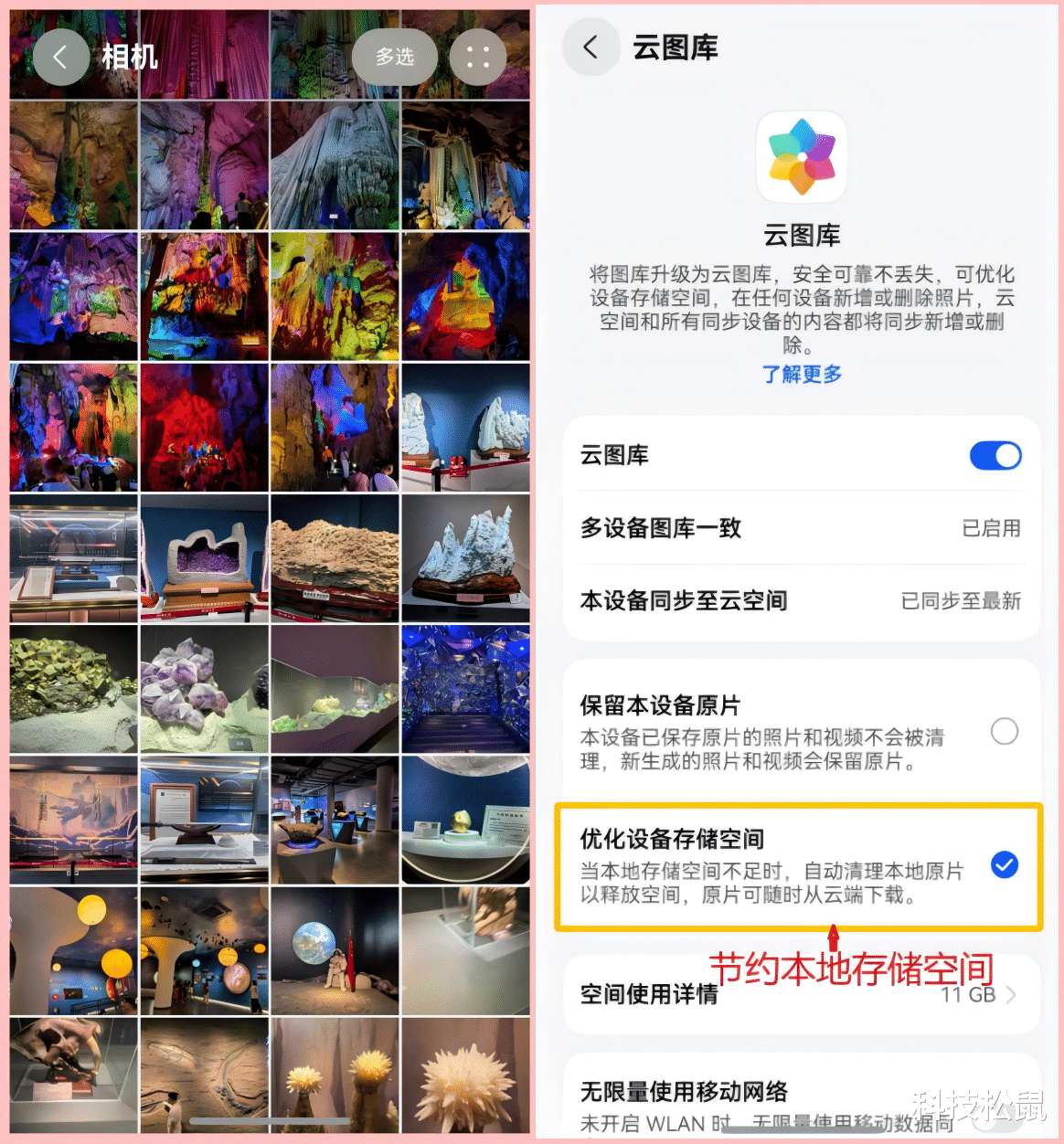 如果是以前,经过国庆中秋长假的“快门洗礼”,手机“空间告急”提醒肯定会如约而至!但是最近我提前打开了手机系统自带的“华为云空间”功能,只要开启“云图库”,然后勾选“优化设备存储空间”,系统就会自动将我拍的照片视频高清版同步到云端,当手机空间不够的时候呢,系统还会很智能地将本地不常用的照片和视频替换为较小版本,从而为手机腾出更多空间,J人表示真的很爽!