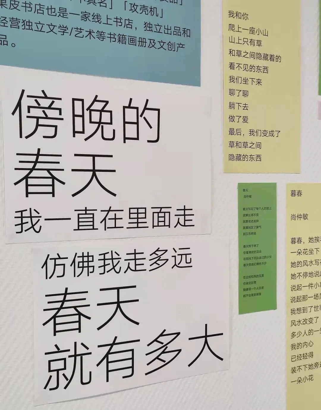 同时,设置了八种关于春天万物的主题便条。观众可以在这里与书、电影、音乐、诗词偶然相遇,带走自己喜欢的推荐或词语,同时,凭借便条大家可以在服务台兑换一袋种子(每日限量500份),邀请你一起播种春天。