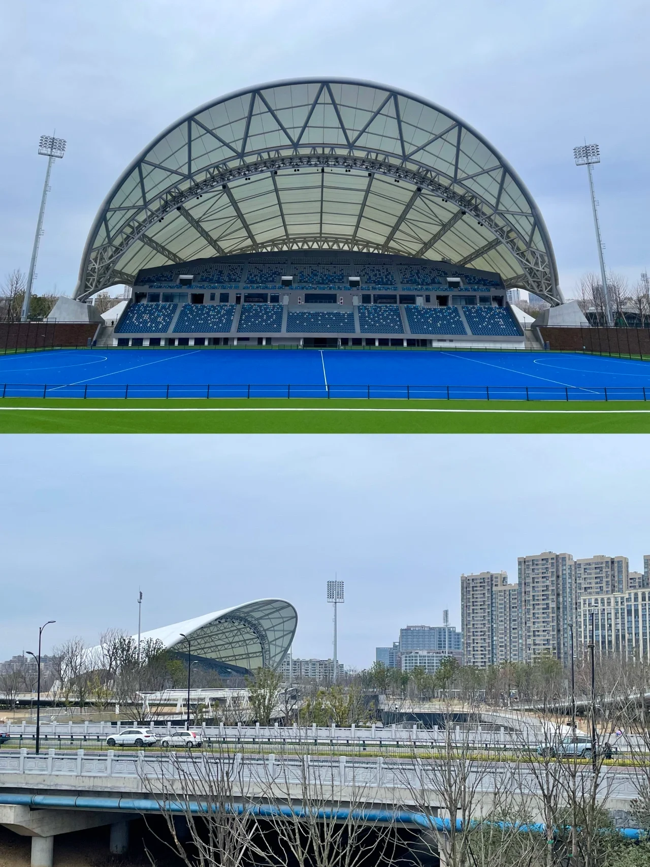 一个轻巧而优雅的大跨度屋盖,为曲棍球场的观众提供了遮蔽。两个苍劲有力的拱型构件支撑着整个看台,上覆交叉纤维的表皮,赋予其地标性的符号感📡