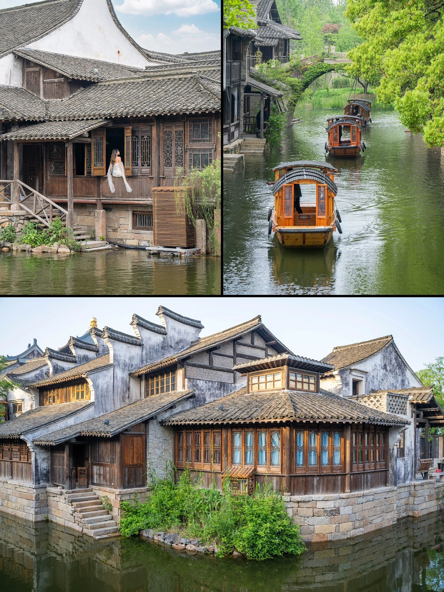 来江南水乡怎能不体验一下摇橹船、河道两旁开满了各色鲜花、仿佛船在画中游