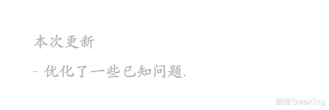 那么这一版本到底还带来了其它哪些新功能和变化内容,很快极客君在深度体验之后,将带来详细的版本更新内容解读。当然,如果大家现在下载尝鲜之后发现了什么新内容,欢迎在下方留言交流~
