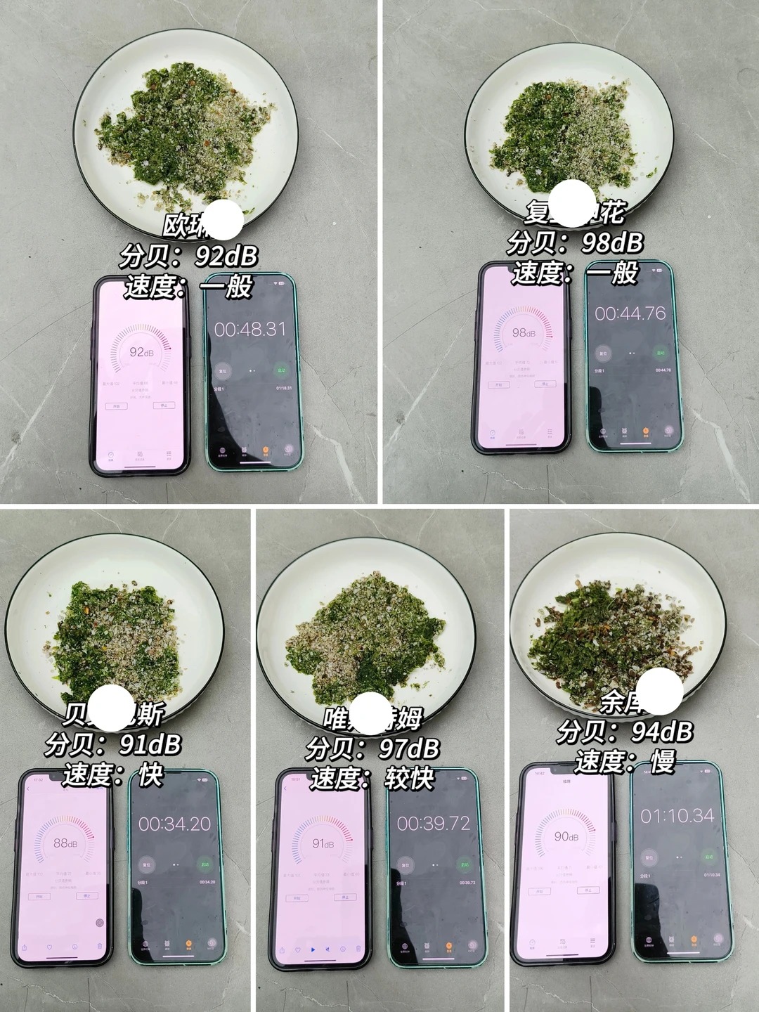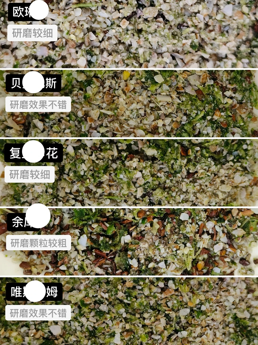对5个品牌产品准备了克重同等下的研磨食材入手进行测试