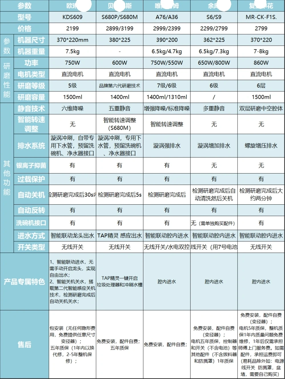 我整理了5个品牌的垃圾处理器数据,做成了表格图片,有需要的可以关+,分享给到大家
