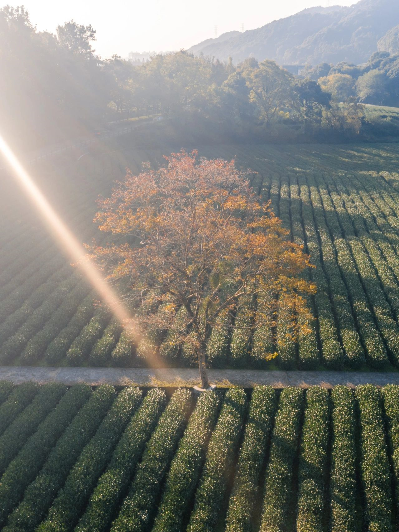 它总是与众不同,一棵树独立在茶园中,当周围的其他树都还是绿色的时候,