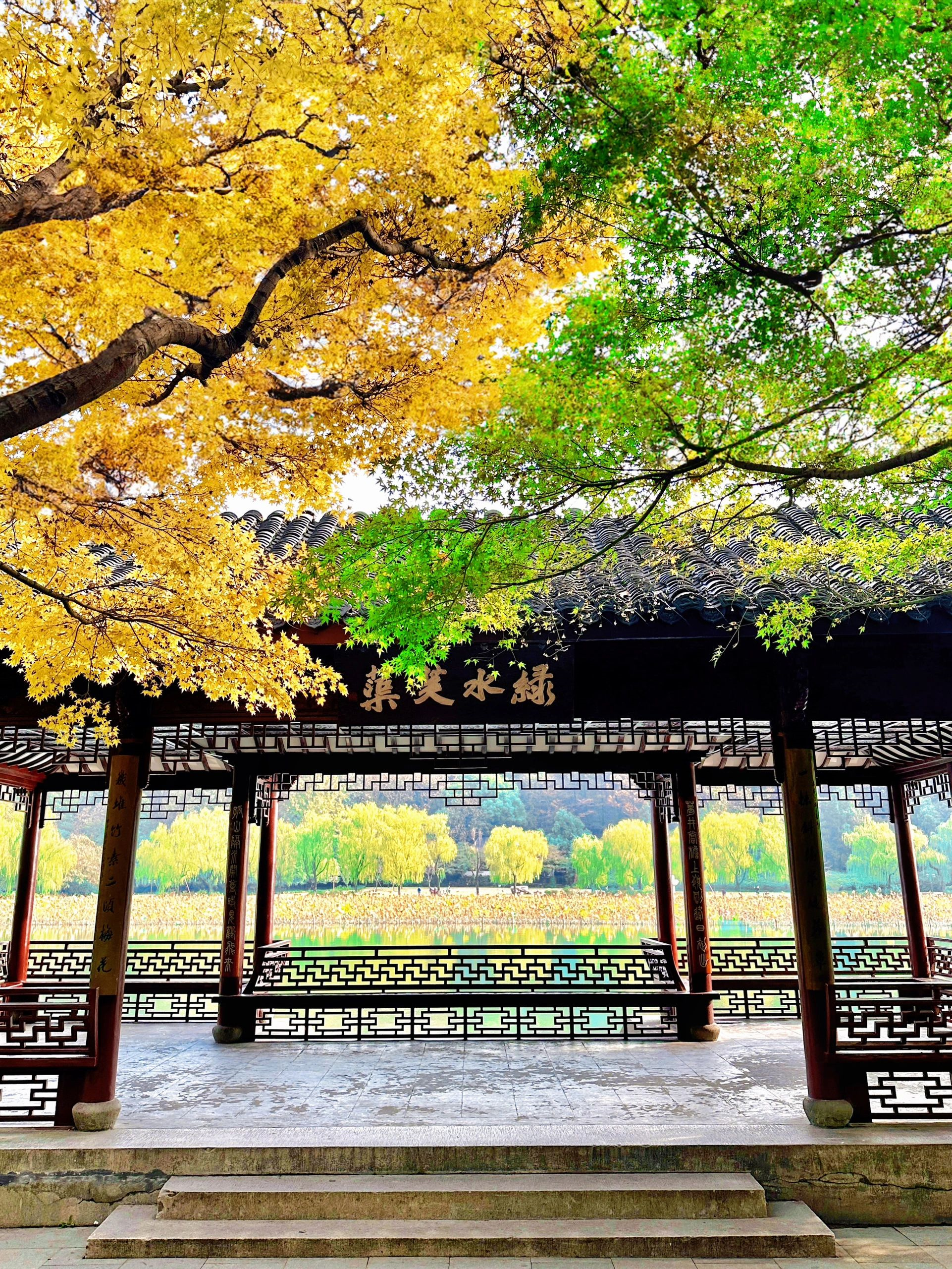 这里有西湖边拍照醉美的座椅,面朝蔚蓝色的湖水,望着眼前三种颜色的树叶,可以发呆一整天