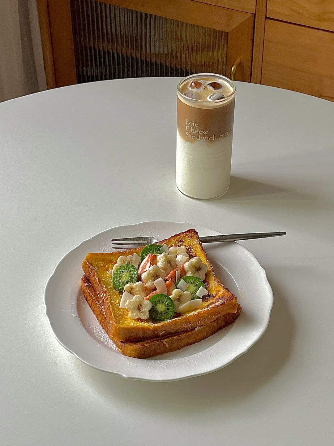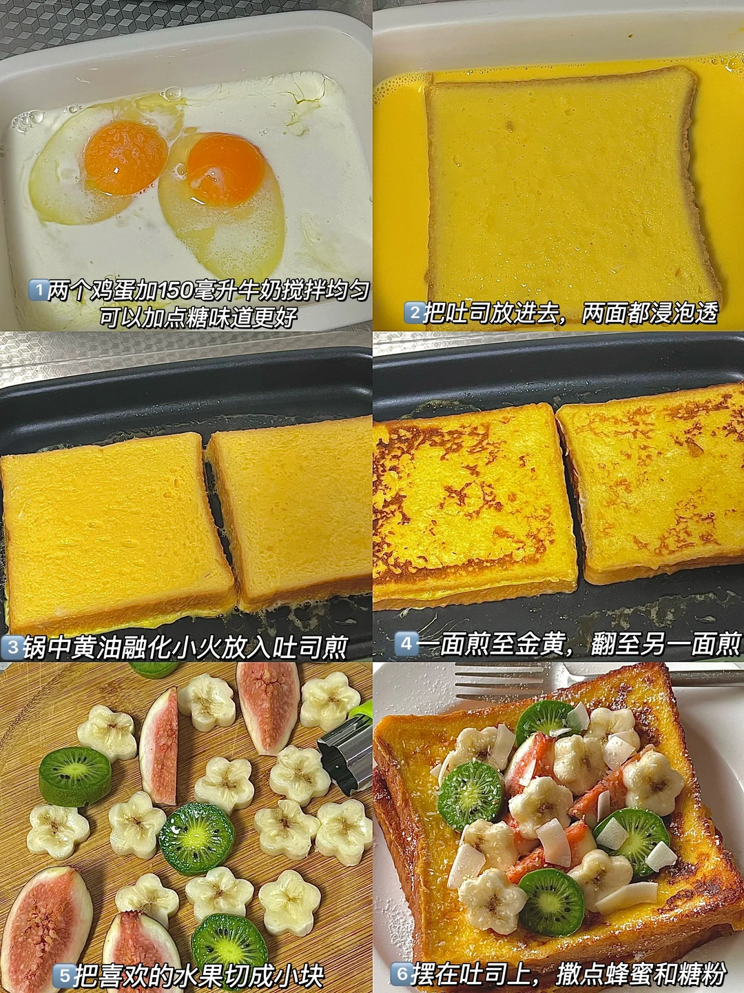 今日份早餐分享: 法式吐司 一杯冰拿铁☕️ . 1️⃣两个鸡蛋加100毫升牛奶可以再加点糖,搅拌均匀 2️⃣把吐司放进去,两面都浸泡透。 3️⃣锅中黄油融化放入吐司,一面煎至金黄再翻至另一面煎,不要太大火哦 4️⃣准备好喜欢的水果,把水果摆在上面,最后撒点糖粉,喜欢蜂蜜的可以再放点蜂蜜。 . 隔一段时间不吃法吐就会馋,简单有快手😋