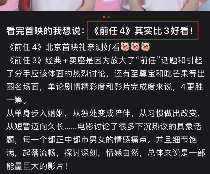 有观众认为,《前任4》远超预期,拍得太真实!也有观众看完后,就表示《前任4》比第三部更好看。