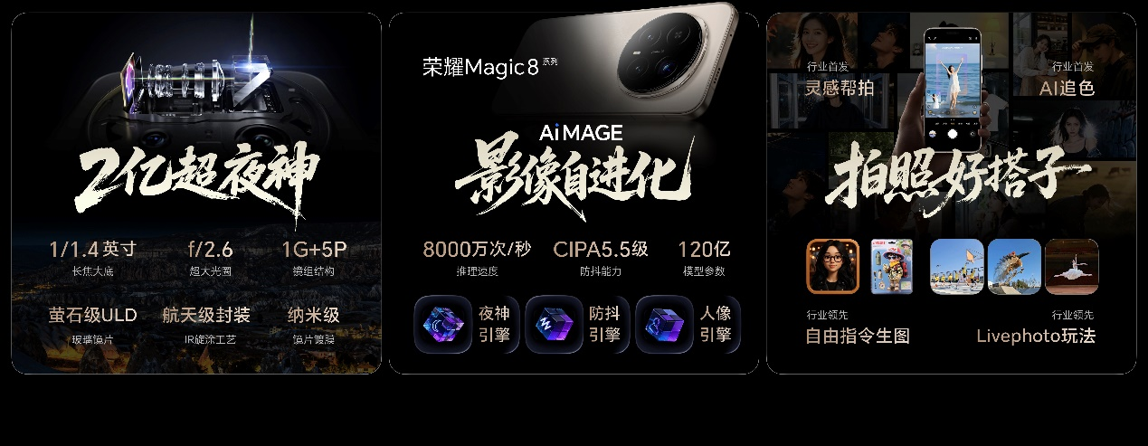 顶级影像硬件配置之外,全新荣耀AiMAGE影像系统也带来了荣耀Magic8系列影像表现进化。AiMAGE·夜神引擎,拥有8000万次/秒推理速度,精确处理明暗复杂光影;AiMAGE·防抖引擎,大幅提升陀螺仪和马达等硬件工作精度,荣耀Magic8 Pro主摄和长焦实现了CIPA 5.5级防抖能力;AiMAGE·人像引擎,高达120亿模型参数,带来肤质优化、光影还原、光斑拟真三大升级,无论日夜,都能拍出大师级人像效果。