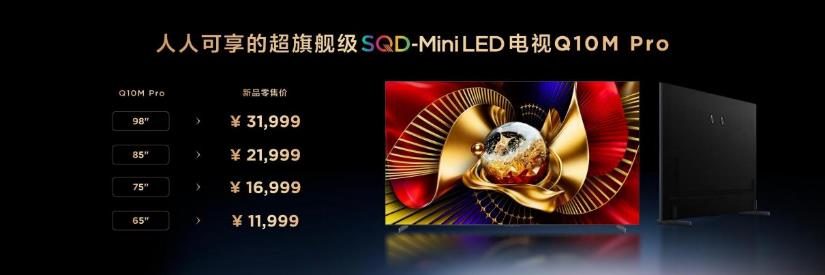 除了巅峰画质,Q10M Pro的综合体验同样拉满。极景·无黑边设计实现近乎100%全屏显示,平板薄机身搭配隐藏式集线设计,座装可两挡调节、挂装贴合墙面,适配各类家居风格;B&O专业音响带来百年经典的纯净原声,配合灵控系统3.0的流畅操作,以及TSR AI光色同控芯片和伏羲AI大模型的加持,2K内容可智能升级为4K画质,让音画体验、外观设计、操作逻辑全面看齐旗舰机皇。这样一款超旗舰配置的电视,定价却极具诚意:98吋31999元、85吋21999元、75吋16999元、65吋11999元,于1月5日开启预售,1月15日正式开售,让曾经遥不可及的旗舰技术变得触手可及。