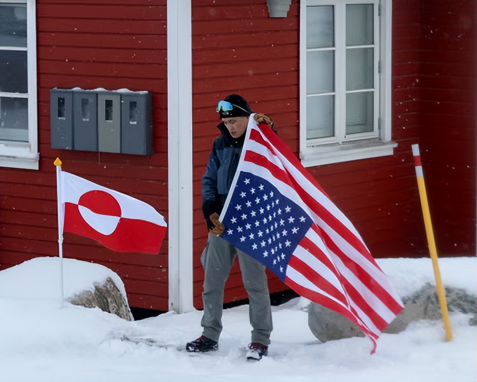 与寻常地图不同的是,格陵兰岛上已经覆盖了美国国旗,吞并岛屿的侵略野心确实是演都不演了...