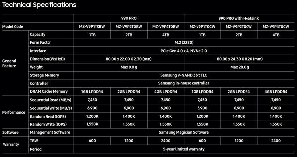三星990 Pro 4TB登陆国内市场,售价为2299元,10月11日开卖。 在规格上,它使用的是M.2 2280接口,支持PCIe 4.0 x4、NVMe 2.0,顺序读写最高7450MB/s、6900GB/s,随机读写140万IOPS、1550万IOPS。写入寿命当然也翻倍来到2400TB,还是五年质保,平均每天全盘写入最多0.33次。
