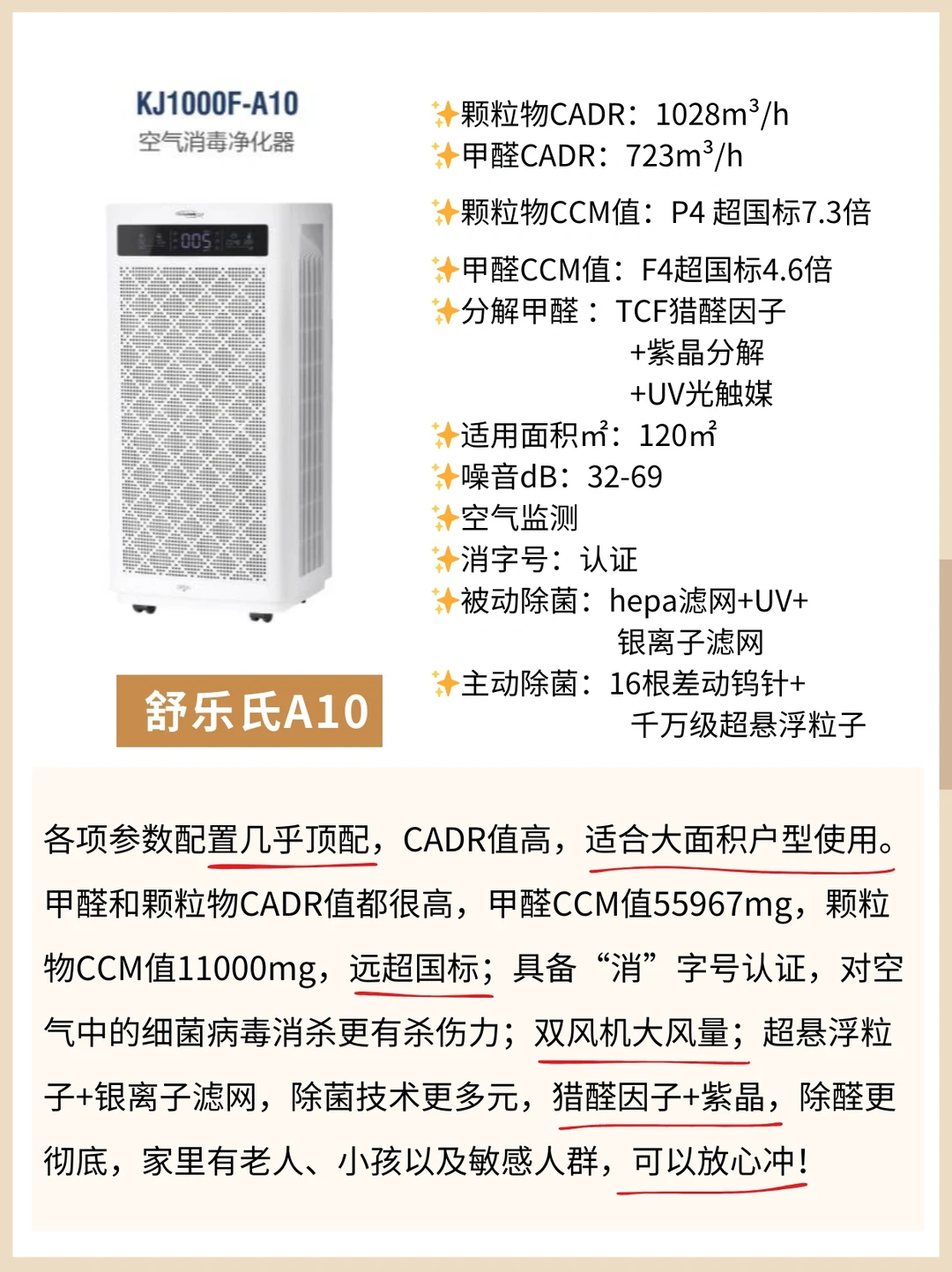 舒乐氏A10空气净化器,CADR值和CCM值都很优秀,远超于国标,和传统的活性炭滤网不一样,采用TCF猎醛因子和紫晶材料双重除醛,用久也不会发酸,采用的是双进双出风结构,四轮涡轮增压循环风道,原地就能搅动周围的空气,净化效率很高,同时除菌率高达99.99%,具有除螨、过敏原和“消”字三重认证,适合预算充足,对除菌除醛有较高要求的家庭