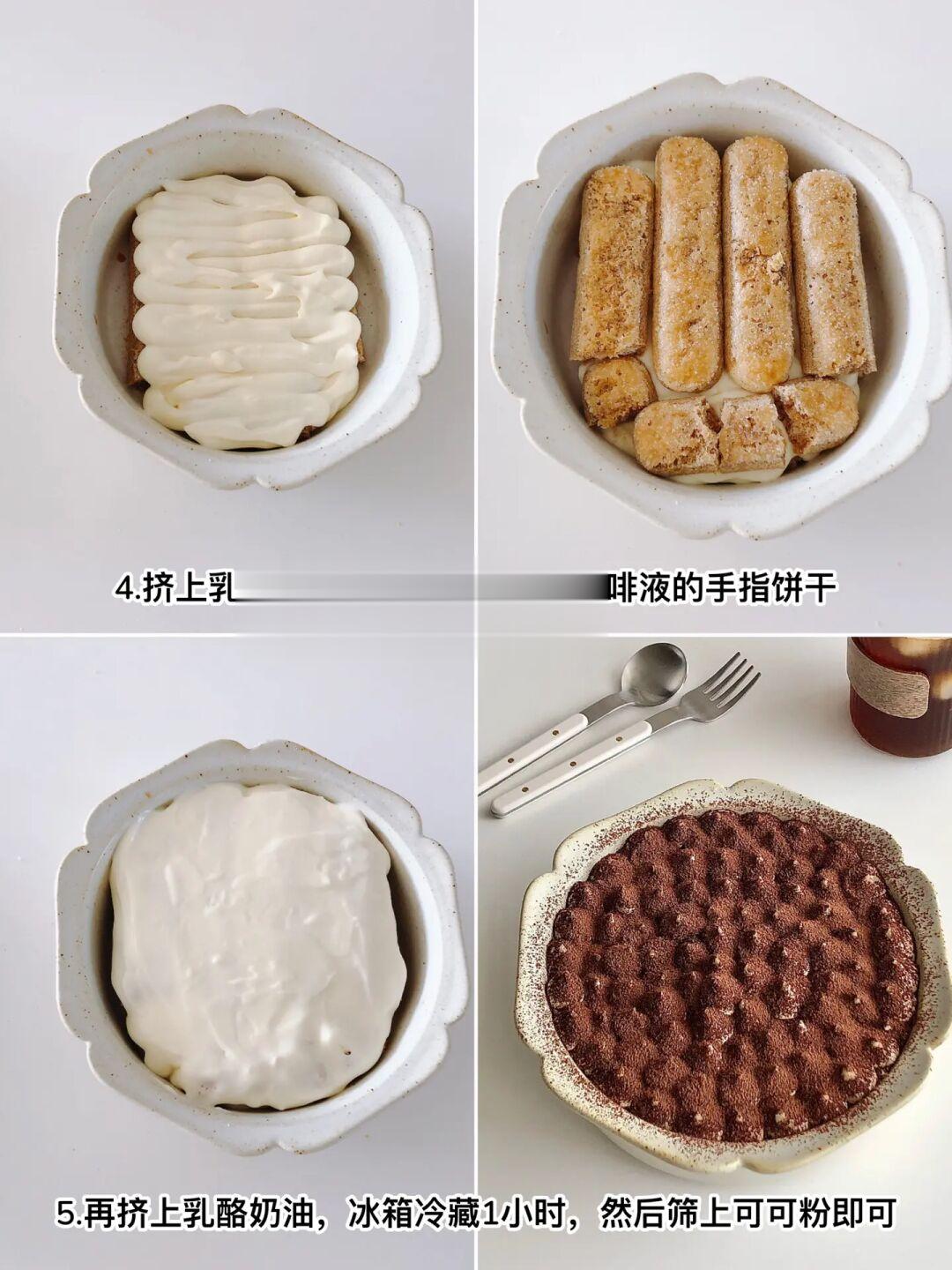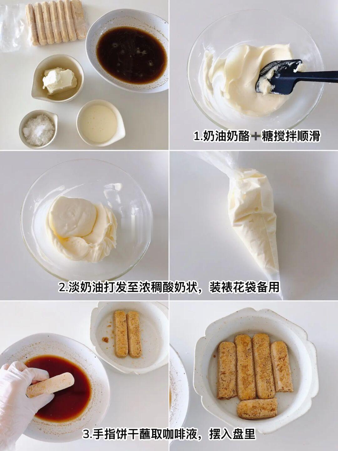 3️⃣手指饼干沾取咖啡液☕️,摆入盘中,挤上乳酪奶油