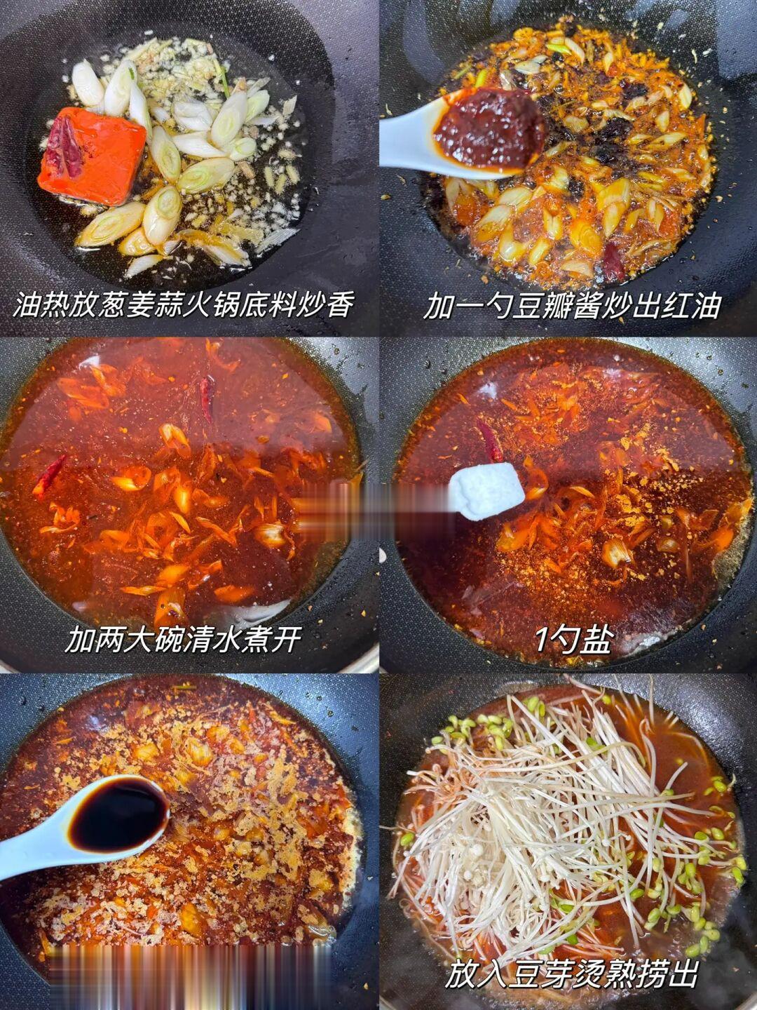 2️⃣起锅烧油,加入葱姜蒜、火锅底料炒香,加入一勺豆瓣酱炒出红油,加两碗清水煮开