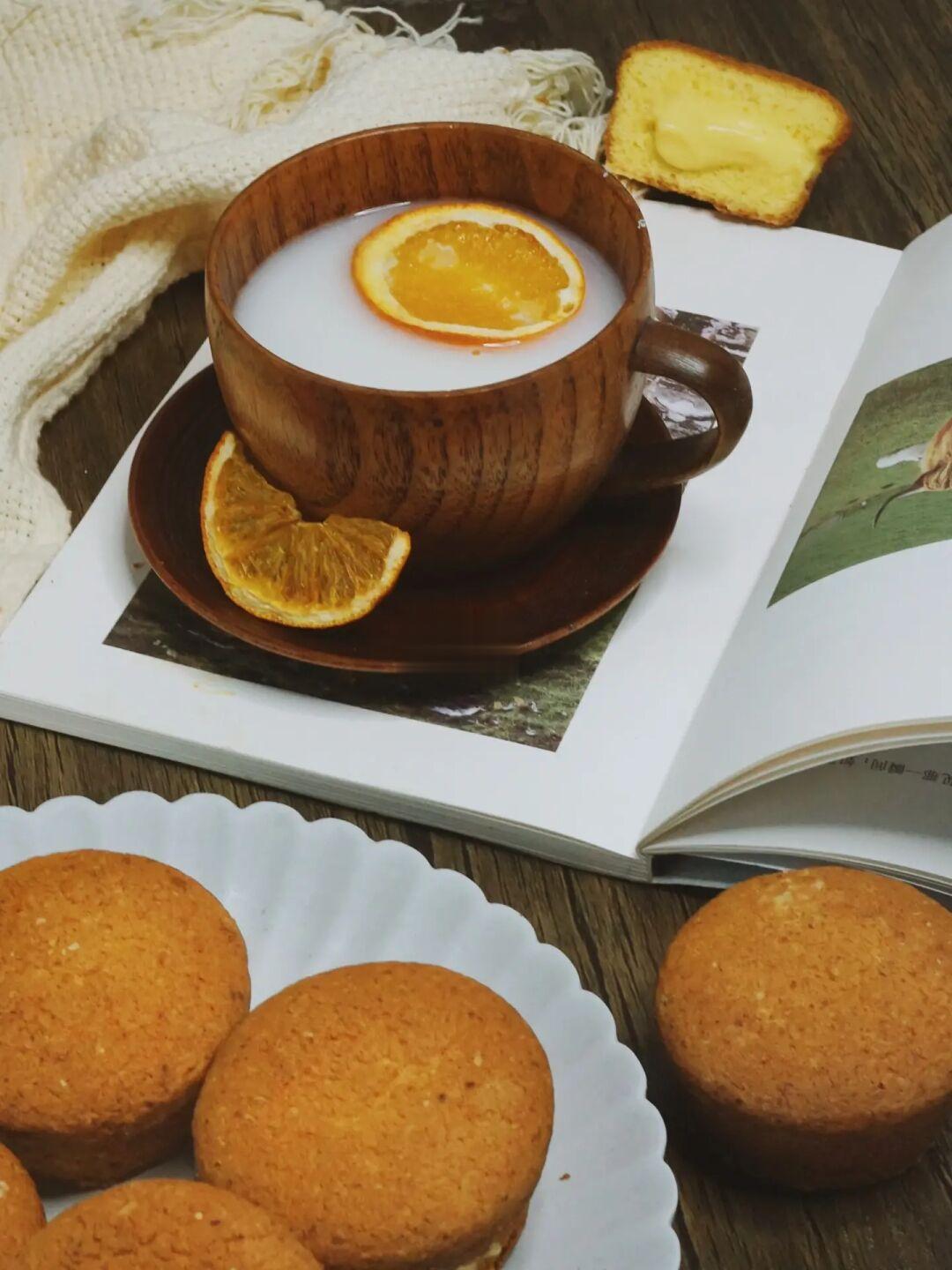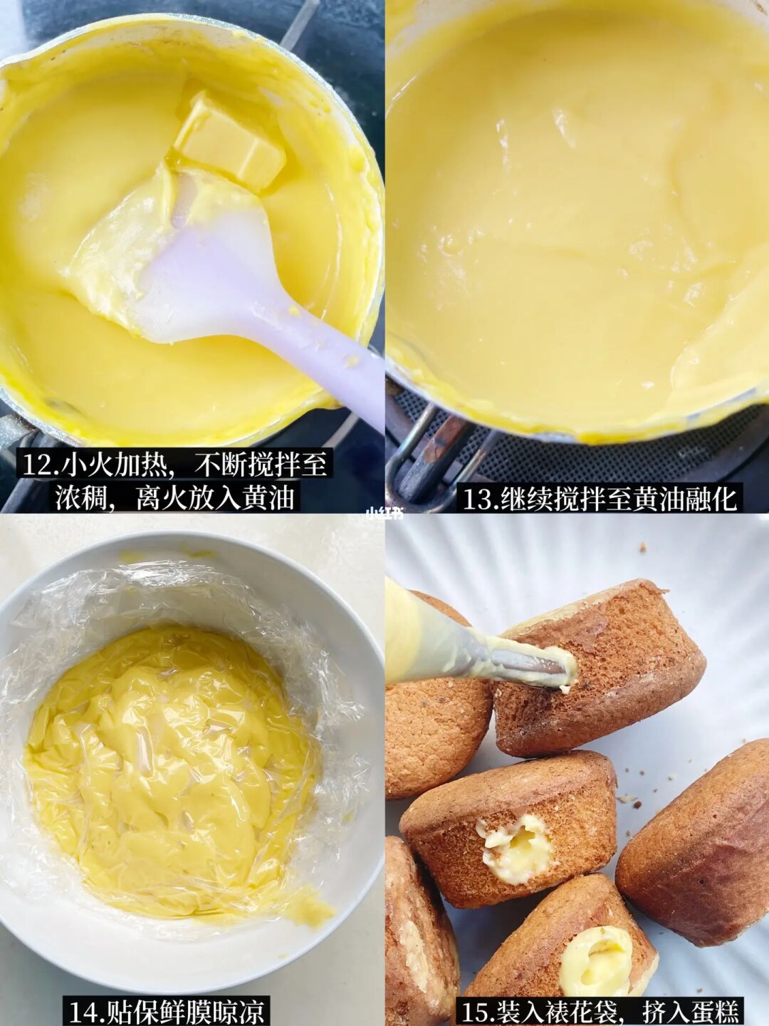 ▪️组装:用筷子从蛋糕的侧面捅 进去,可以左右转一下,让中间空心。然后把卡仕达酱装入裱花袋,挤入蛋糕里。