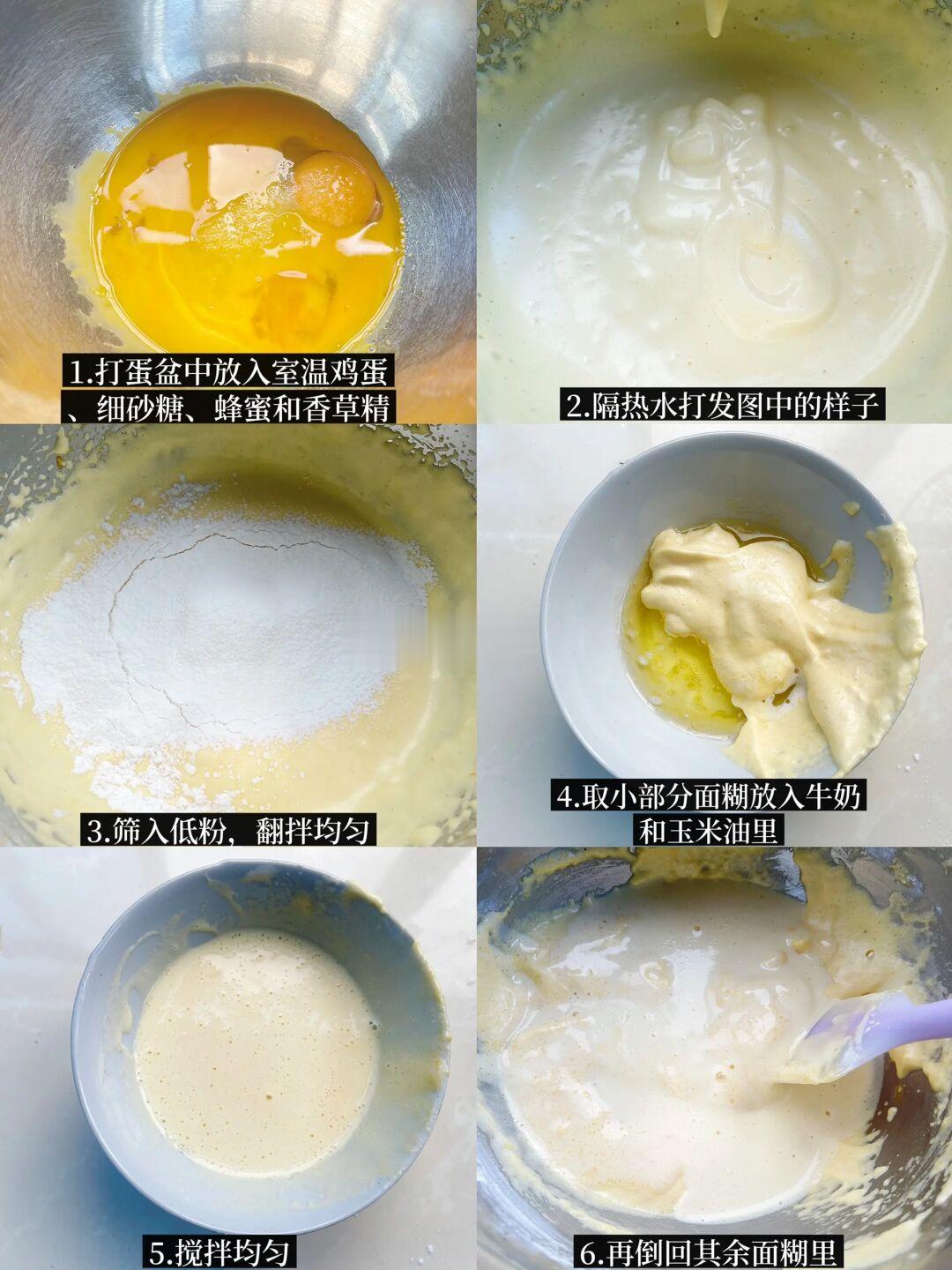 蛋糕:全蛋3个 细砂糖60g 蜂蜜10g 低筋面粉75g 牛奶30g 黄油25g 香草精2滴
