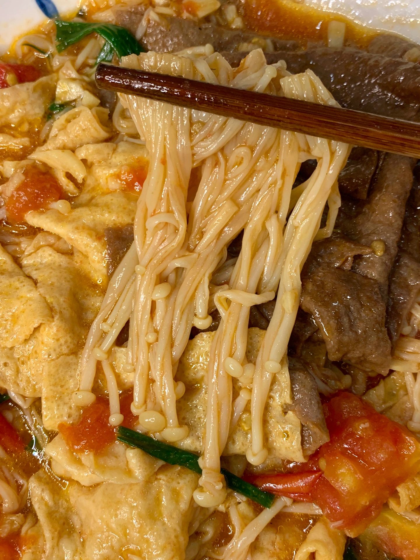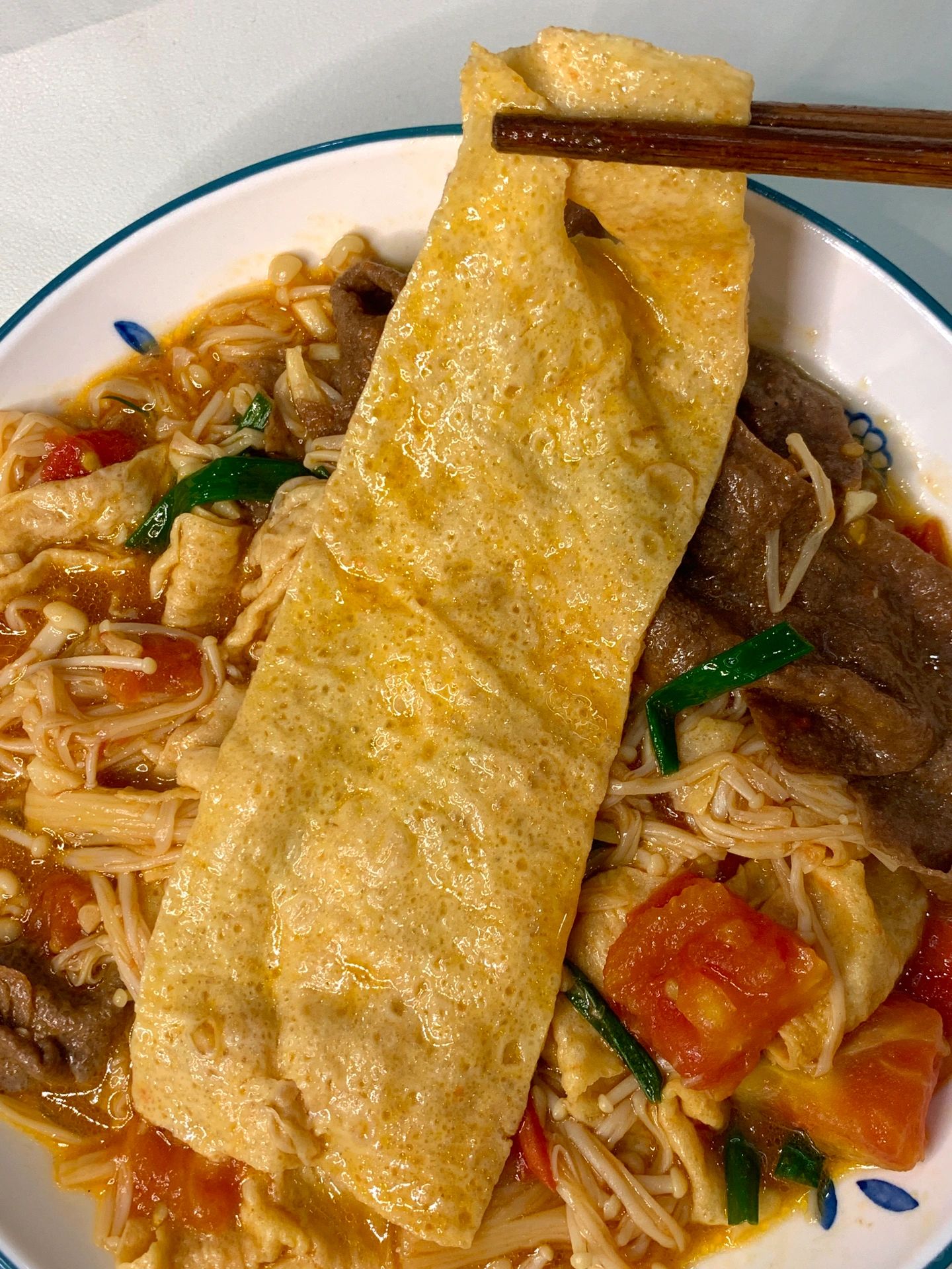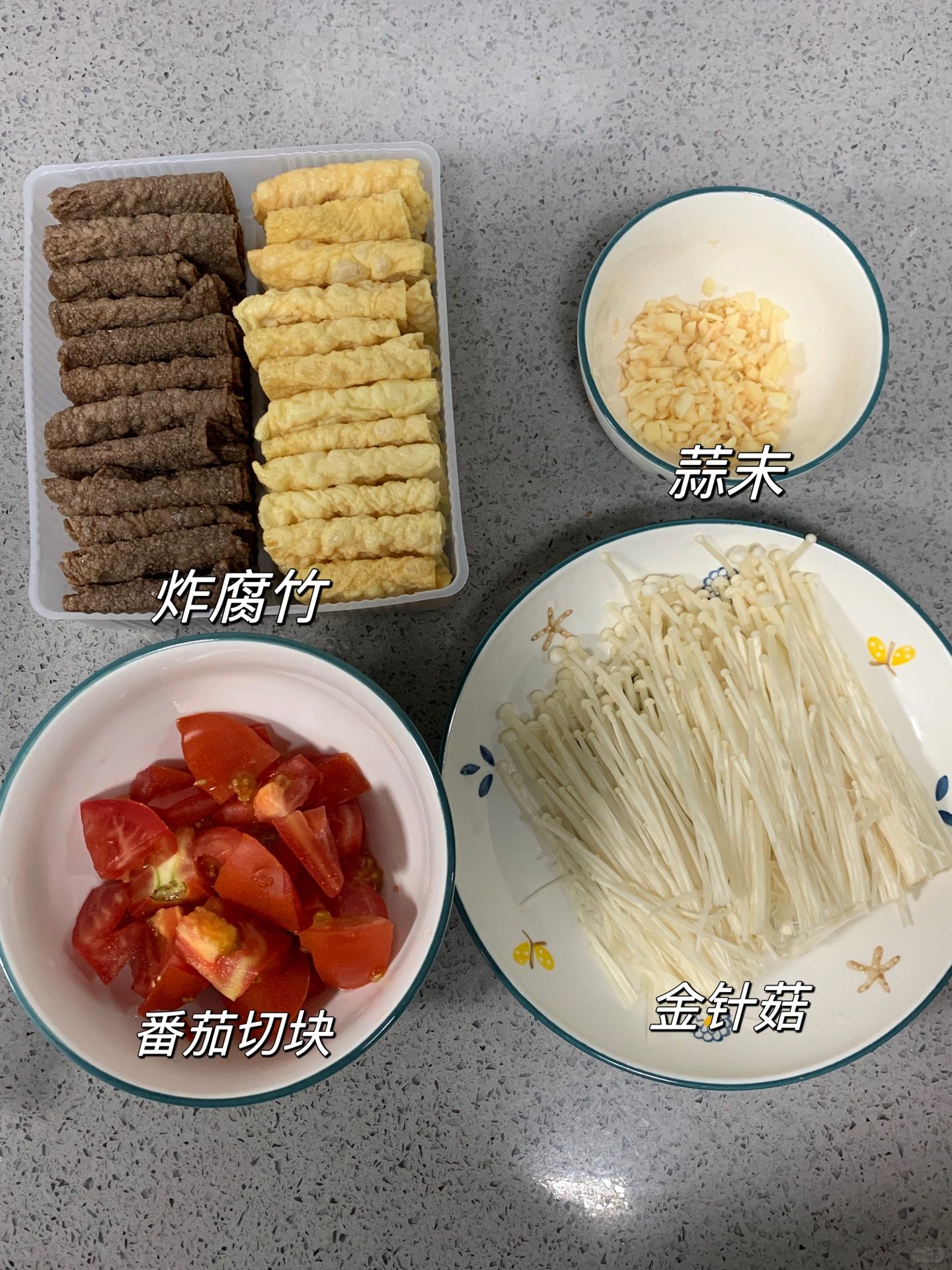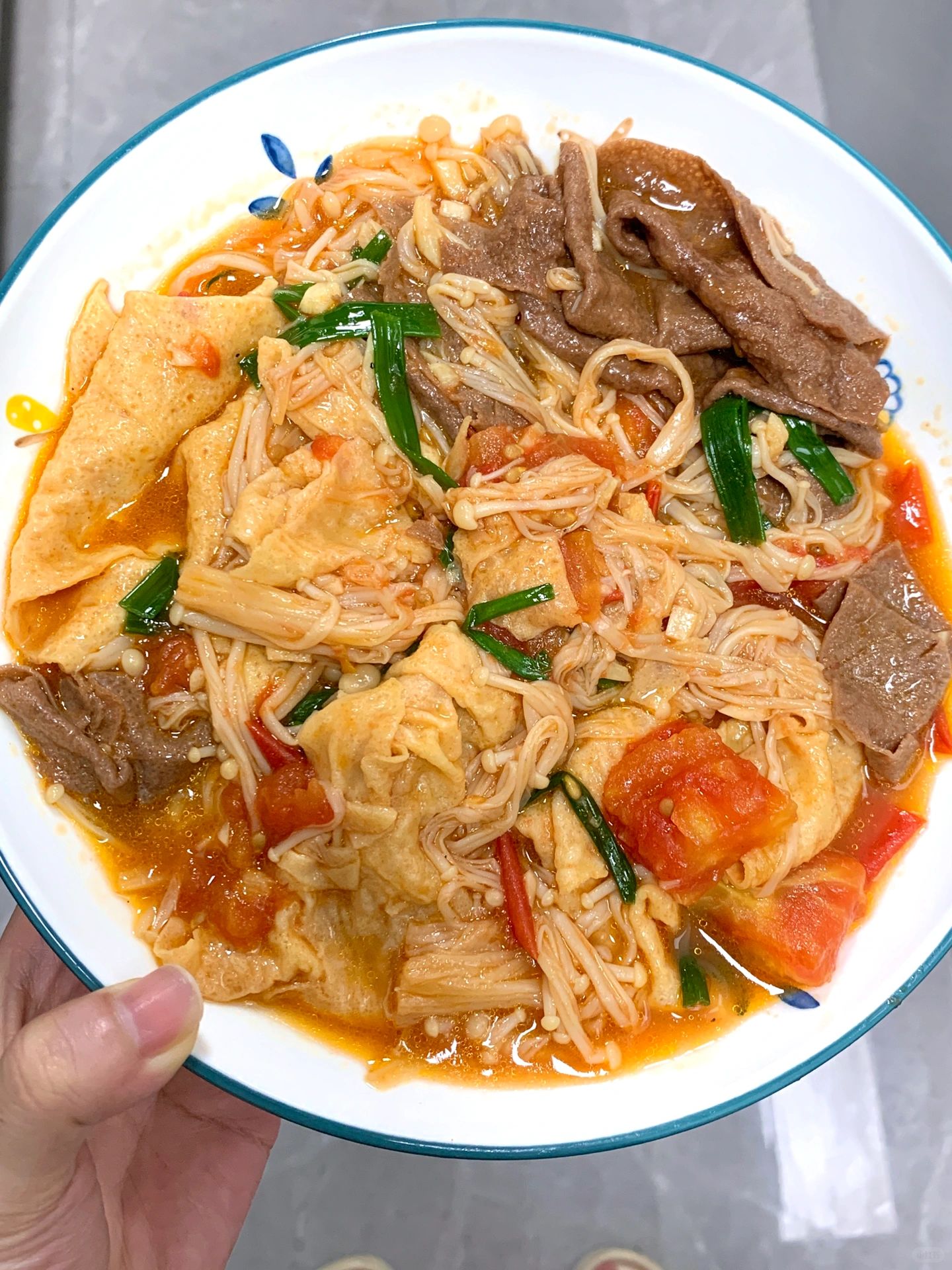 [星R][星R][星R]最近发现了一道下饭神器,吸满汤汁的辅助腐竹焖金针菇,[派对R][派对R]鲜汤巨鲜,用来拌米饭太绝了,一锅米饭都不够吃!! [放大镜R]食材:炸腐竹、金针菇、番茄、蒜末 [放大镜R]做法: 1⃣️油热下蒜末爆香,加入番茄块翻炒出汁,加入金针菇翻炒均匀 2⃣️放入腐竹块,加2勺生抽、少许盐和鸡精,加适量清水焖煮5分钟,撒上葱蒜即可