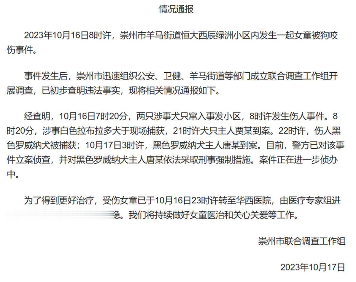 综合央广网、上游新闻报道,10月16日8时许,四川成都崇州市2岁女童在小区楼下遭一只罗威纳犬咬伤致肾挫裂伤,引发全网关注。10月17日17时许,四川崇州市联合调查工作组就“女童被狗咬伤事件”发布情况通报。通报中称,警方已对该事件立案侦查,肇事犬只已被捕获,并对黑色罗威纳犬主人唐某依法采取刑事强制措施。受伤女童已于10月16日23时许转至华西医院,由医疗专家组进一步治疗,目前生命体征平稳。