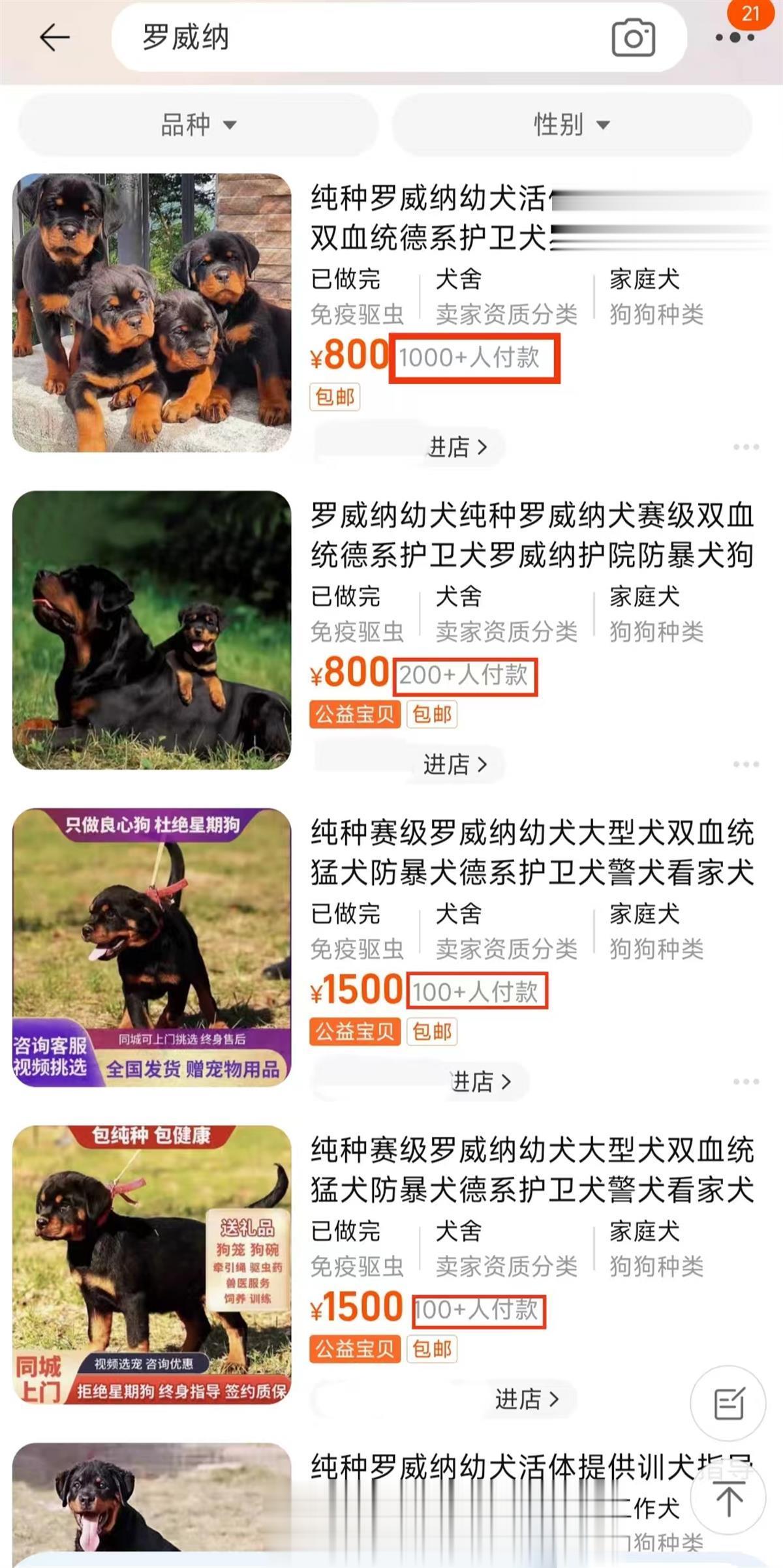 罗威纳犬网购价800元到2000元不等,多个店铺月销过百,动保协会:属大型护卫犬,不适合在城市饲养