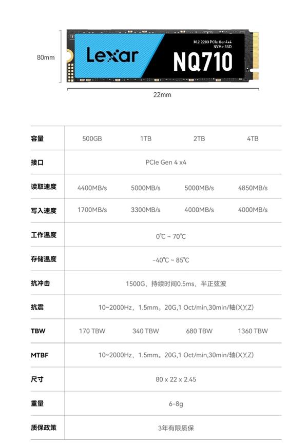 雷克沙SSD新品NQ710正式开售,其有500GB、1TB、2TB三个版本,价格分别为269元、369元、629元。 NQ710 SSD采用PCIe 4.0协议,向下兼容PCIe 3.0,顺序读取速度可达5000MB/s,顺序写入速度可达4000MB/s。他采用2280规格,一体化单面设计,可兼容笔记本电脑、台式机等设备。雷克沙官方提供3年有限质保,写入量对应分别为170TWB、340TWB、680TWB。 未来雷克沙还将推出4TB版本,写入量为1360TWB,价格暂未公布。