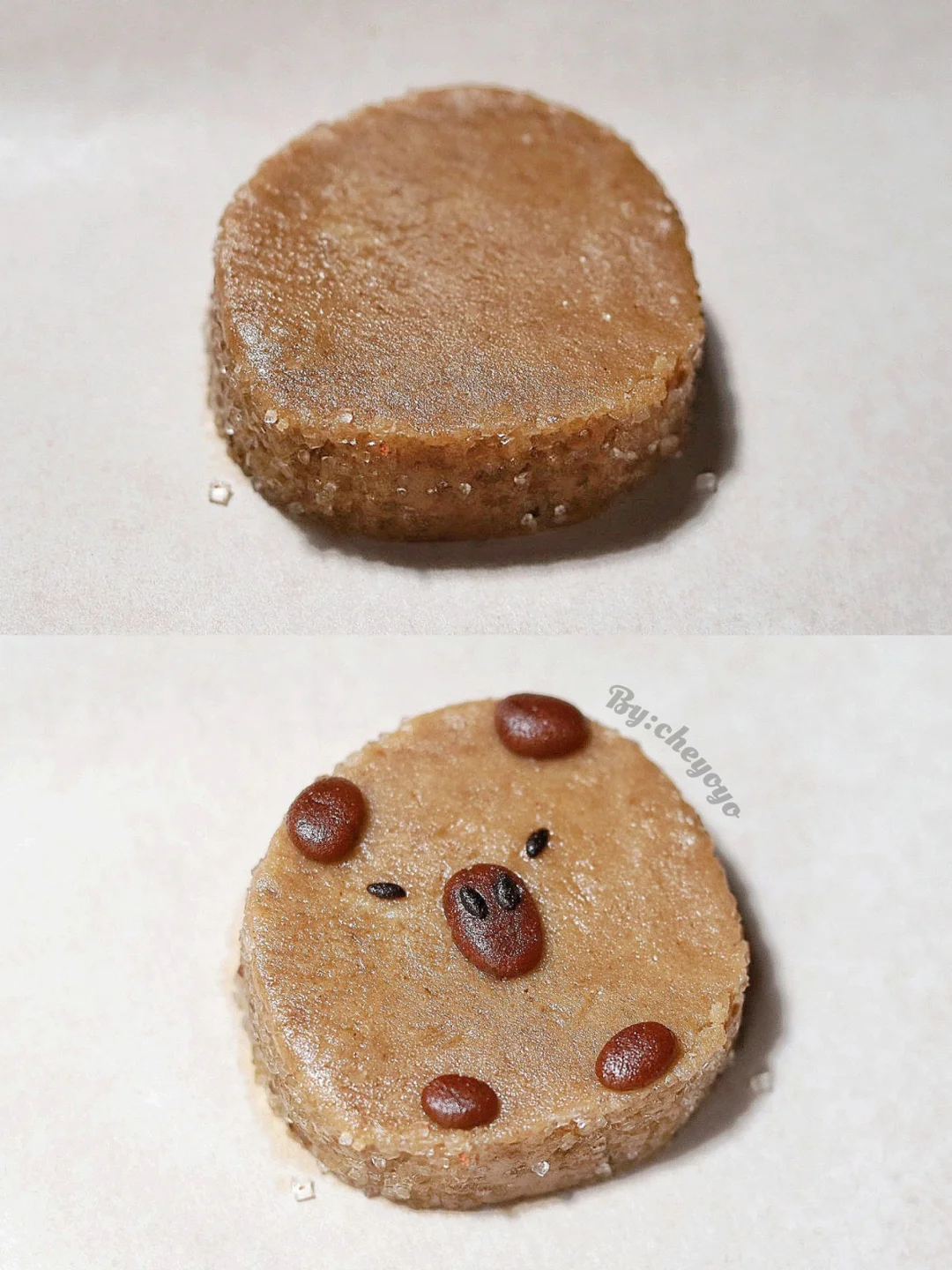 4⃣️ 冻好的面团滚上砂糖,切1cm厚片,均匀摆在烤盘上,用小面团制作安装耳朵、鼻子、鼻孔、爪爪;