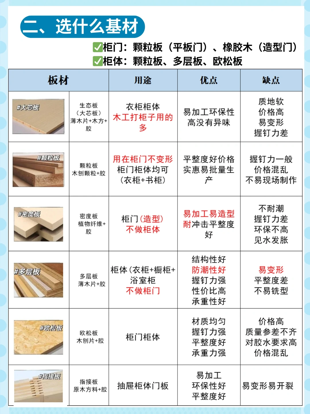目前常见的基材有颗粒板、多层板、欧松板、实木板