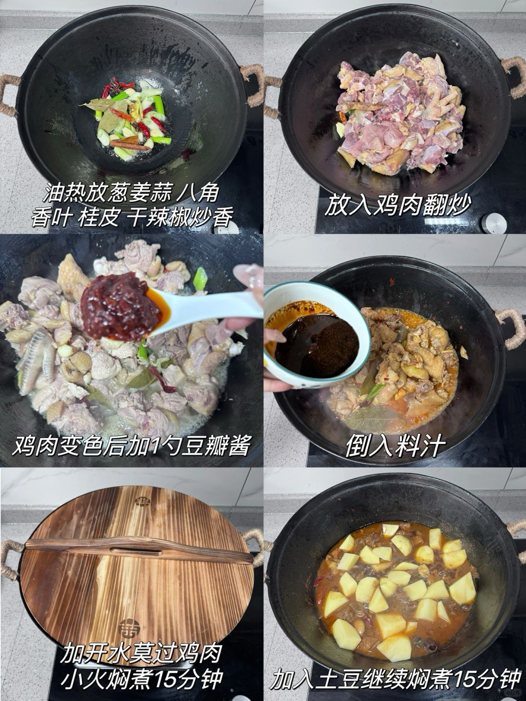 3️⃣油热下葱姜蒜 桂皮 八角 香叶 干辣椒炒香,放入鸡肉炒至变色,加一勺豆瓣酱翻炒,倒入酱汁翻炒均匀