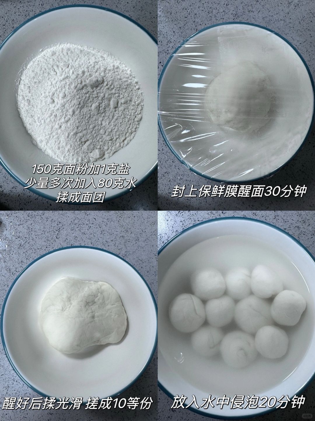2️⃣150g面粉加1g盐,少量多次加入85g水揉成面团,封上保鲜膜醒面30分钟,再揉光滑,分成10等成小剂子浸泡20分钟