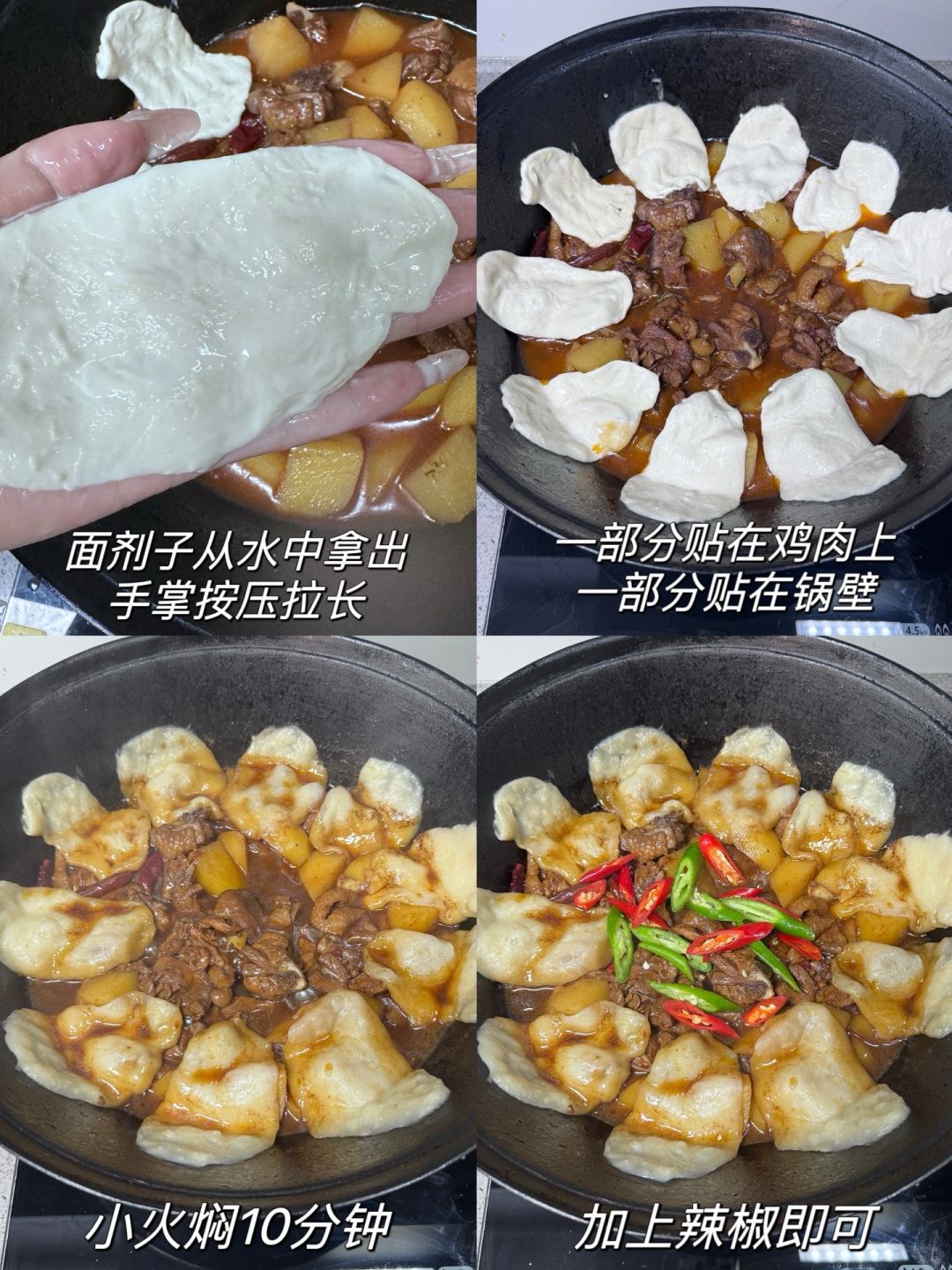 5️⃣从水中拿出面剂子,用手掌按扁拉长,一部分贴在锅壁,一部分贴在鸡肉上