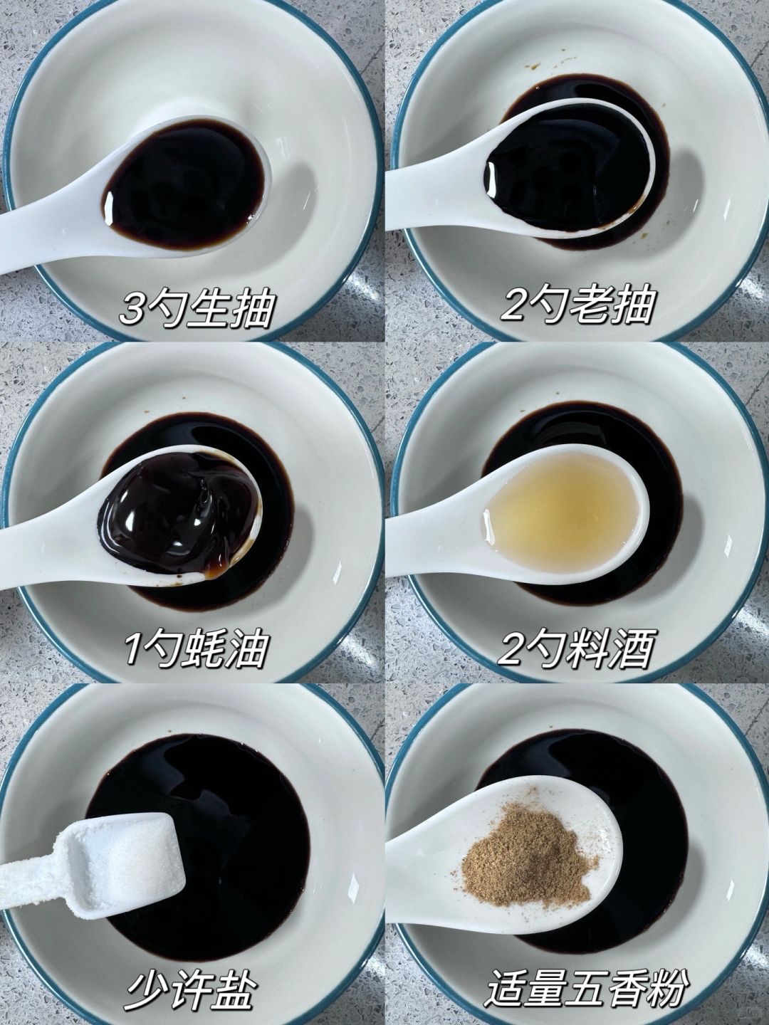 1️⃣调酱汁:3勺生抽、2勺老抽、1勺蚝油、2勺料酒、小半勺盐、适量五香粉