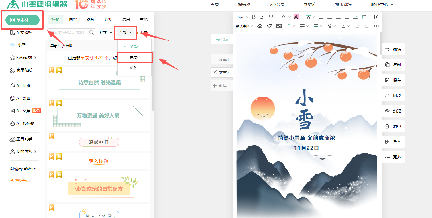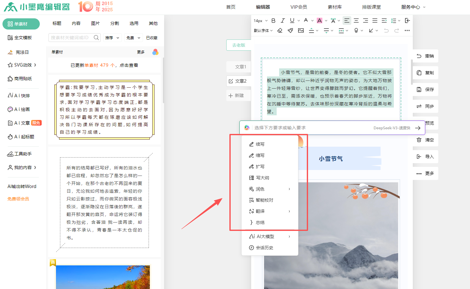 她点开编辑器的素材库,指着那海量的模板说:“看见没,这些都是免费的!随便用!”然后,她演示了怎么用鼠标把看中的样式直接拖到文章里,文字放进去,格式自动就匹配好了。更让我惊掉下巴的是,她点开一个AI按钮,把我那写得干巴巴的文案放进去,选择了“润色”,几秒钟后,一段生动流畅的文字就生成了。