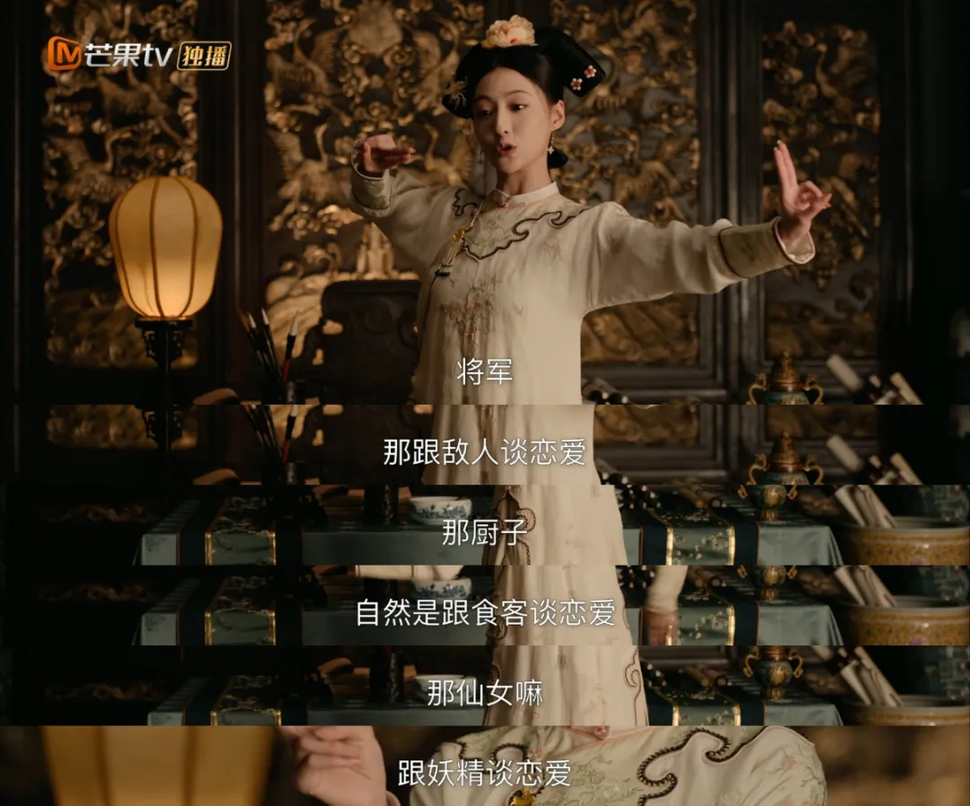 如在第7集里,众人齐聚漱芳斋吃烧烤,小燕子脚下一滑,将手里的食材抛到空中,永琪却扔出签子将它们串成一串,具有一种魔性的喜感,完全不按套路出牌。