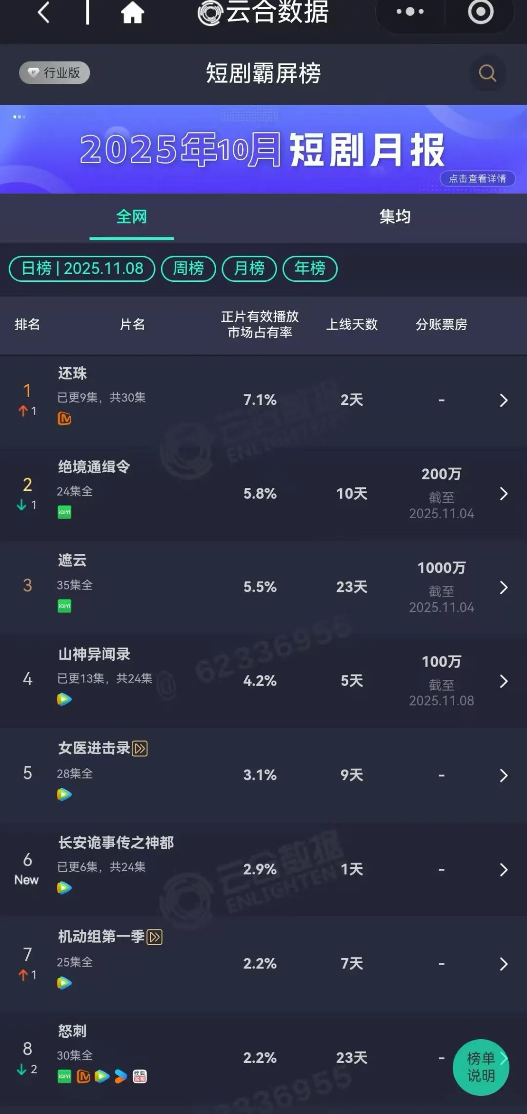 截至11月14日,短剧《还珠》在芒果TV的累计播放量达3.6亿,连续四天位居云合短剧全网榜榜首。超级IP引发全网热议,微博热度指数突破7008万,创短剧热度峰值纪录。