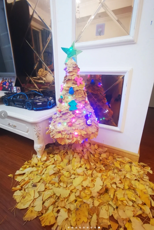 孩子心心念念的银杏叶🎄圣诞树🎄做好了 圣诞节就要到了,妹妹想要一颗圣诞树,看到小红书推荐的树叶圣诞树,我就想去摘点树叶回来做,把想法告诉妹妹后,首先跟我说,妈妈不要去摘树叶,我们就去捡树叶就好了,让我很感动,确实我潜意识觉得摘树叶没什么(但这是不对的),趁周六天气也很好,我们捡了三袋树叶,支架之前买好的拼刀刀十块包邮,然后去五金店买了一根一元钱的pvc管3元钱细铁丝,准备工作就做好了。 首把支架搭好,然后用钳子把细铁丝剪三条一样长的对折,固定在顶端,像伞骨架一样,然后再剪一段接成圆形固定在“伞架”最下面,固定好后按照越往上越短的规律接一些小圈然后套在上面,这时候所有的接头都不太固定,我用热熔胶把所有接口和交叉的地方固定了全都带,骨架就搭好了。 其次,用平时缝衣服线按照各种方向绕,绕的密一点,为了有更多定位点,我在最下层圈上用热熔胶点了很多个颗粒,这样在绕线的时候可以绕的又细又均匀,这样圣诞树🎄的基本形状就出来了。 第三,从下向上一圈一圈的贴叶子,必须按照一圈一圈贴,不要一块一块贴,一直贴到最上面,把最上面多余的叶梗剪掉,然后在树身上妹妹捏的粘土,上面固定上用硬纸板涂成绿色剪成的星星⭐️,并在树身上缠绕彩灯,也是拼刀刀买的6毛钱一根,缠了6根,银杏树叶圣诞树🎄就做好了啦! 我们捡的银杏叶还剩了好多,就堆在树下了,这样看起来更有氛围一些,你学会了吗?