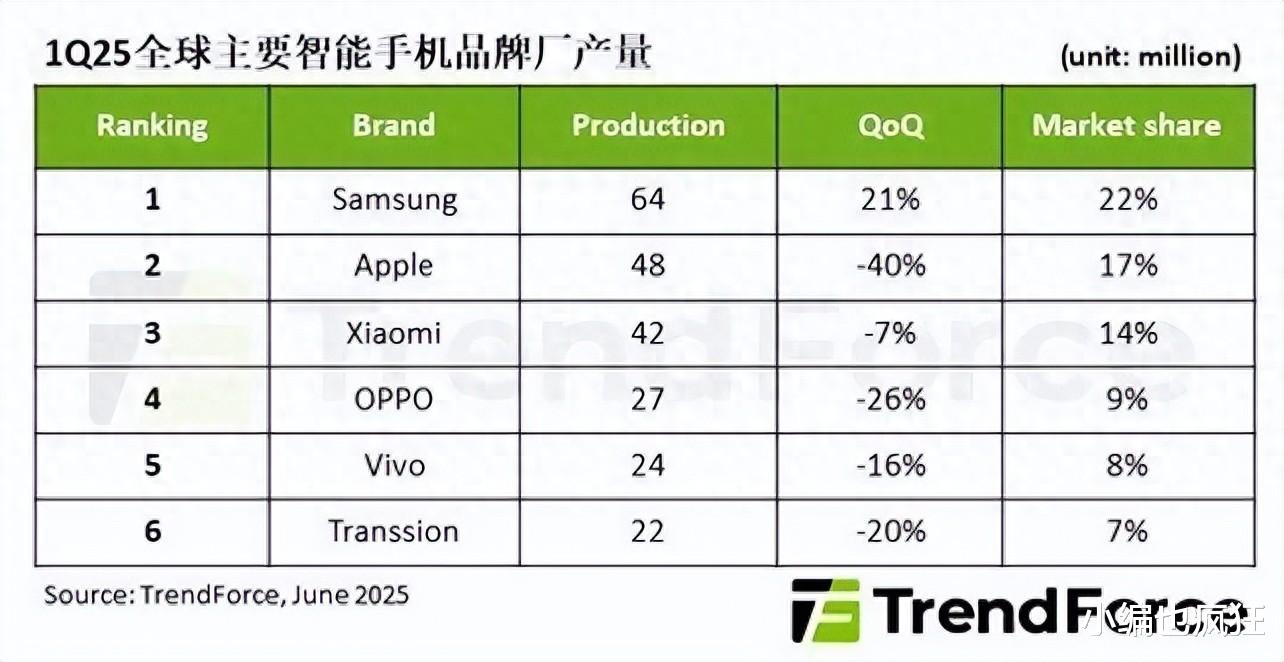 2025年第一季度,全球智能手机市场表面看只是同比下滑了3%,实则风暴暗涌。这不再是简单的“谁多卖了几台手机”的季度账本,而是一场品牌间的路线选择和战略重构的总检阅。从TrendForce披露的产量数据来看,智能手机行业正在进入一个“谁掌握未来话语权,谁就可能重新定义格局”的关键转型期。