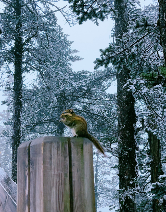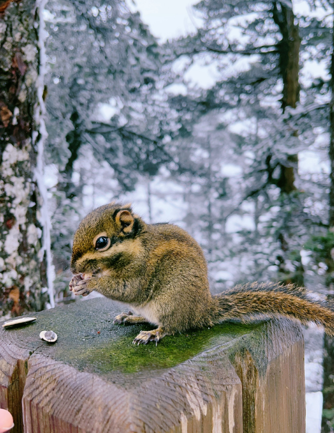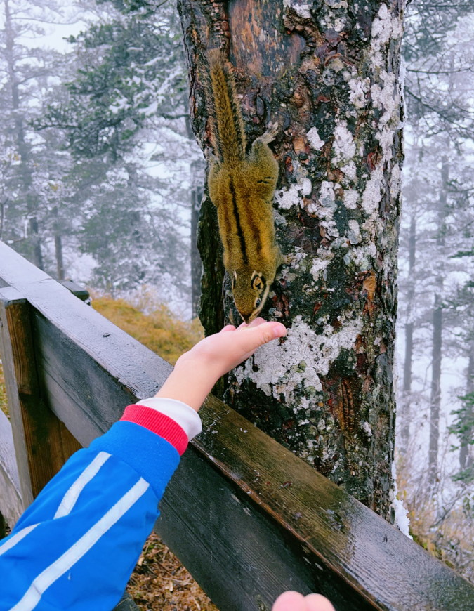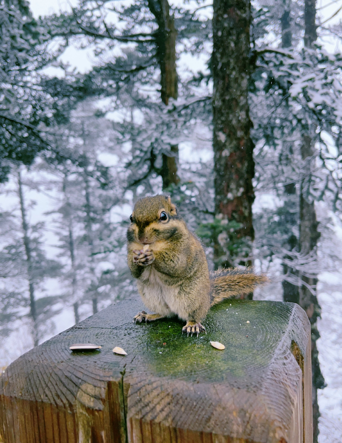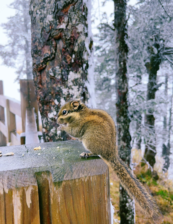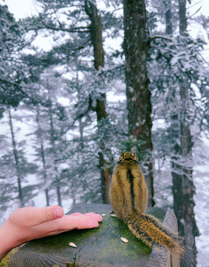 赏雪喂松鼠!孩子的快乐就是这样简单。西岭雪山顶,一路都看到小松鼠,鬼精鬼精的,它