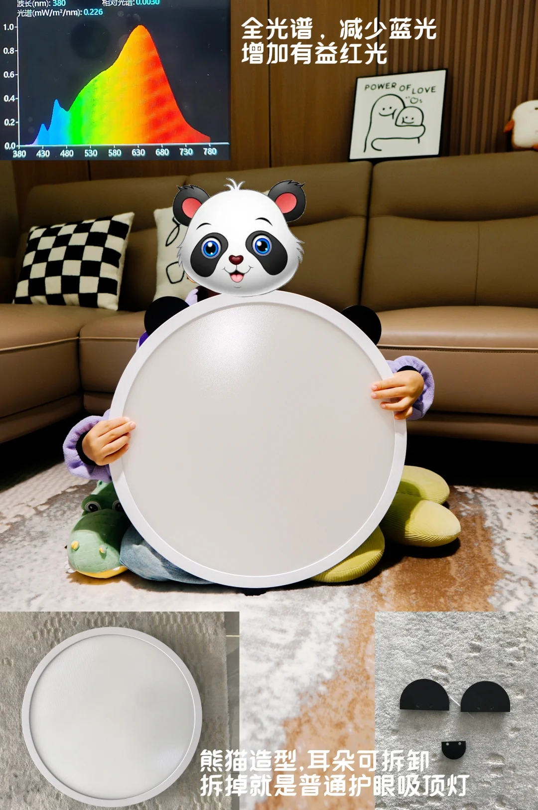 老板:与顶面有缝隙的,落灰难清,尽量选超薄一体式设计,密封无缝,不压层高,不会进蚊虫。想要颜值高,可以类似熊猫造型这种简单造型的,耳朵可拆卸,拆掉就是普通护眼吸顶灯