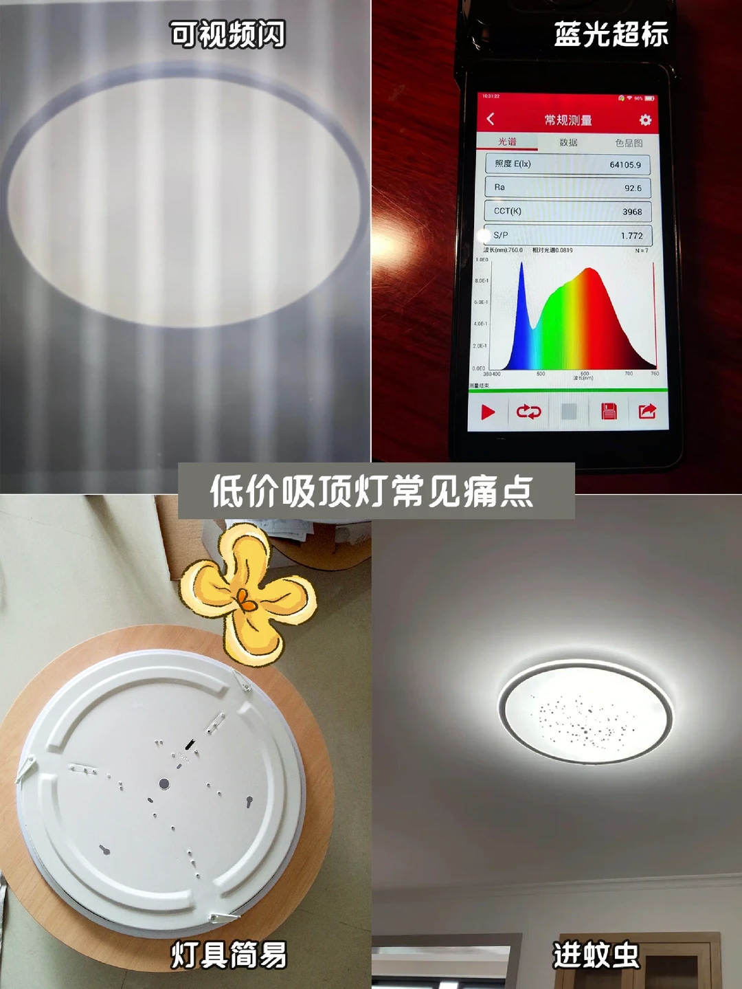 老板:便宜的吸顶灯,也就看个亮,出现可视频闪,蓝光也容易超标,伤害眼睛