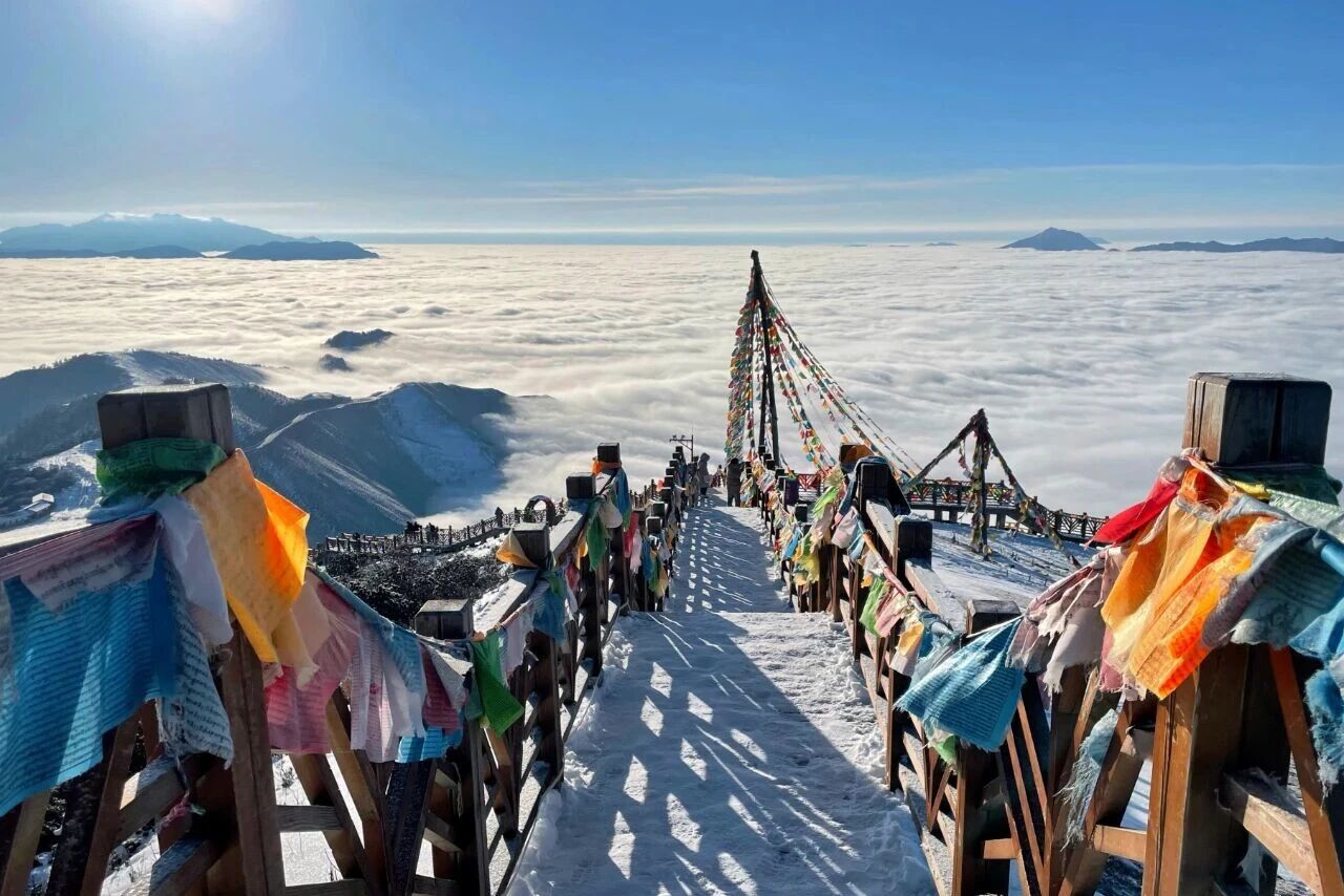 当缆车抵达海拔4860米的雪山之巅,站在观景台上,群山在阳光下熠熠生辉,云海翻腾,天地辽阔,你仿佛真的站在了云端之上。