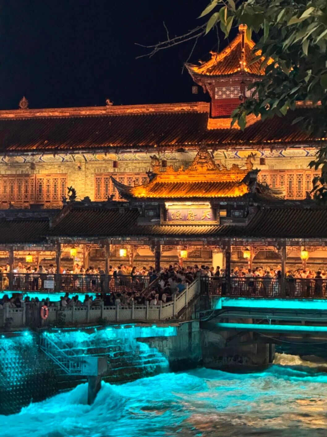 站在桥上,看那神秘而美丽的蓝色江水在脚下奔腾而过,与两岸古老的建筑形成奇妙而迷人的对比。从南桥向东步行约700-800米至天府源廊桥,那里的观赏效果更加震撼,定会让你流连忘返。