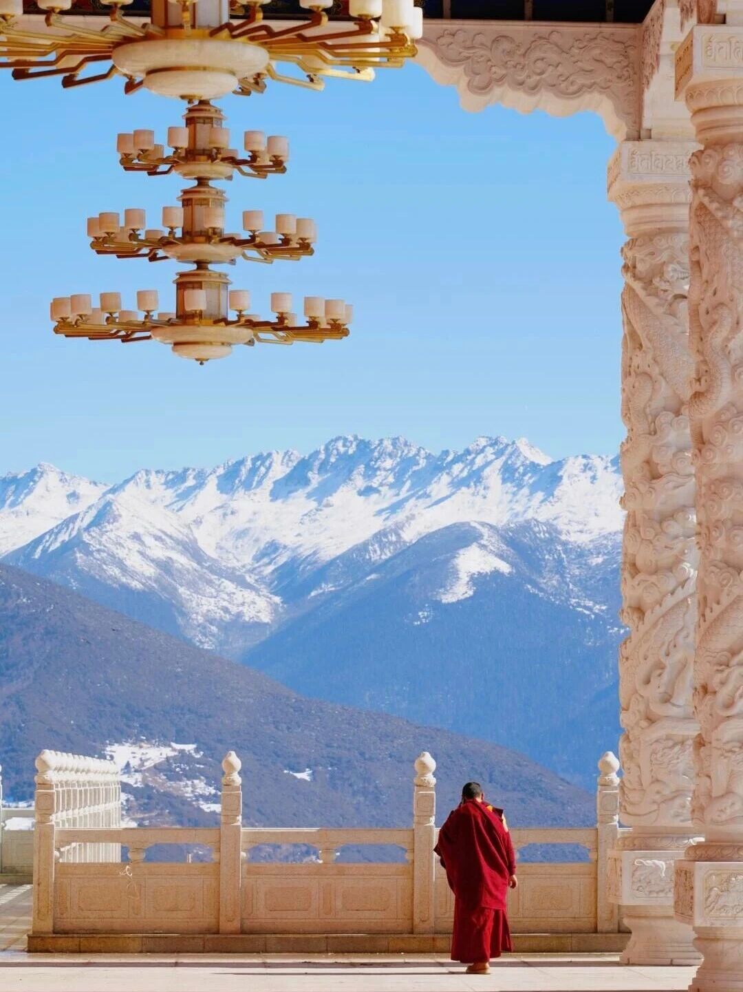 昌列寺:雪域中的“云顶天宫”坐落在雪山环抱山坡上的昌列寺,红墙金顶在皑皑白雪的映衬下,显得格外庄严与醒目,被誉为川西的“云顶天宫”。