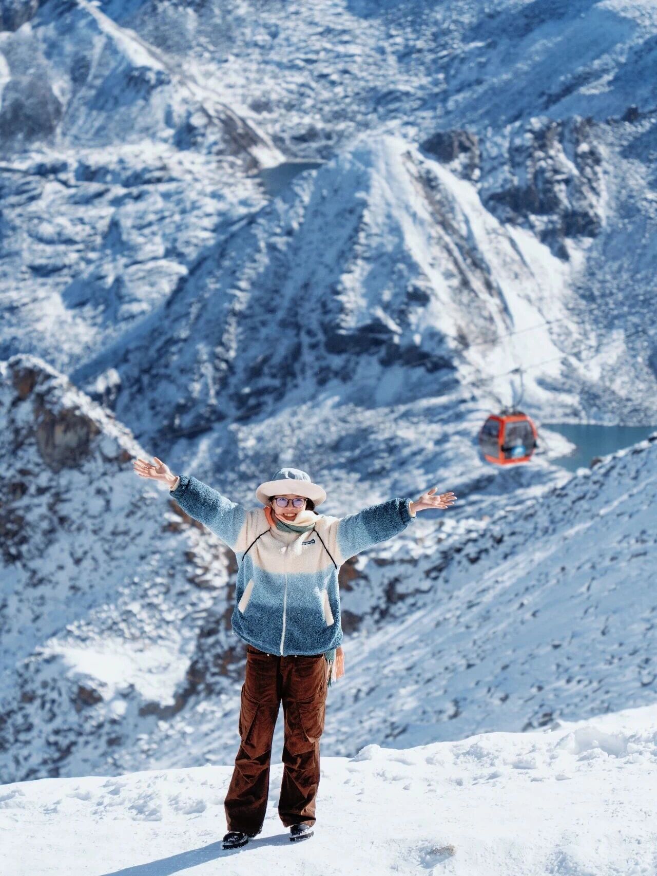 乘坐全球海拔最高的缆车,穿越云雾,缓缓上升。窗外,从墨绿的森林草甸渐变为无垠的银色雪原,仿佛驶向一个纯净的童话世界。
