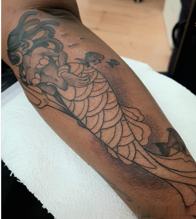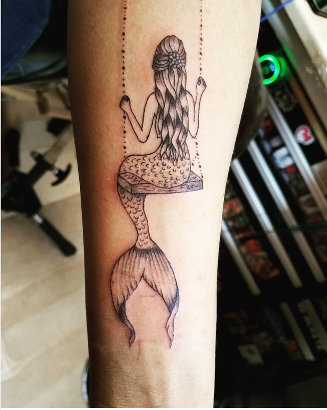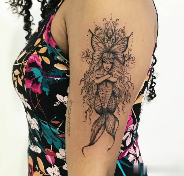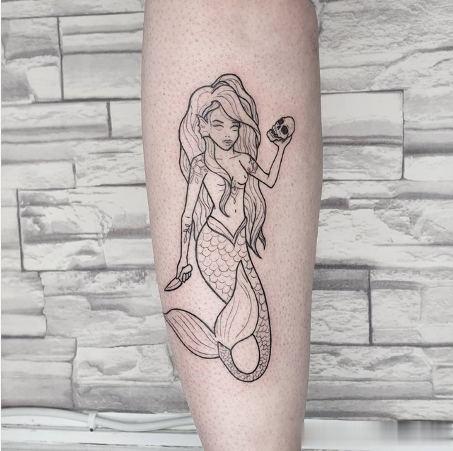 这件神奇的作品将线条与阴影相结合,形成了传统与现代相结合的设计。这是一个简单的美人鱼纹身,又大又漂亮。