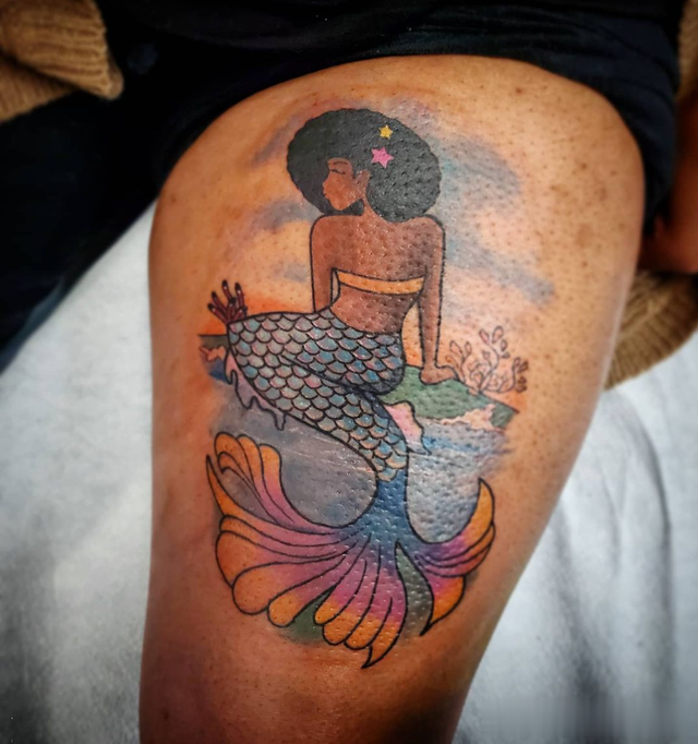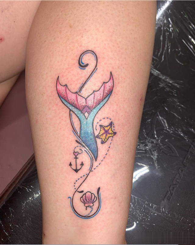 这个美丽的美人鱼纹身有一条色彩鲜艳的尾巴。