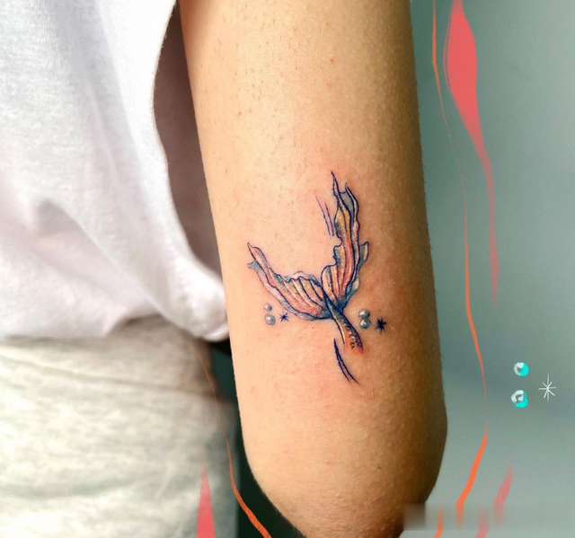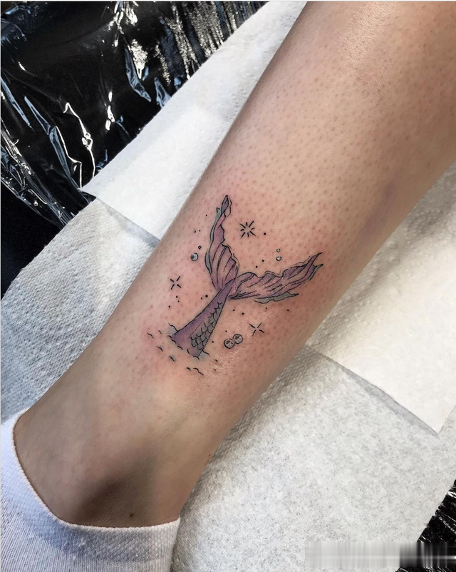 这条柔和的美人鱼尾巴颜色为浅紫色和粉红色,带有蓝色星星和气泡,形成如此可爱的小美人鱼纹身。
