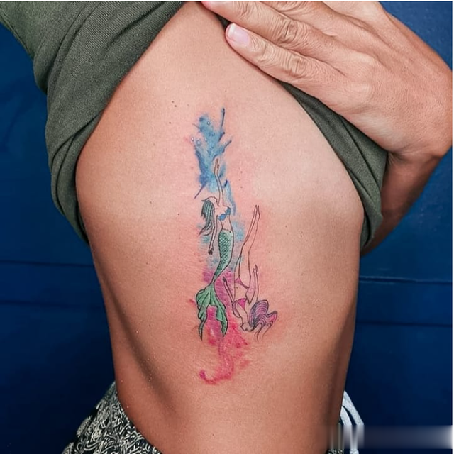 水彩美人鱼纹身的特点是美人鱼和人类在美丽的色彩海洋中平行游泳