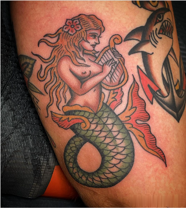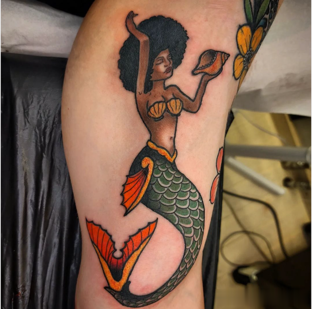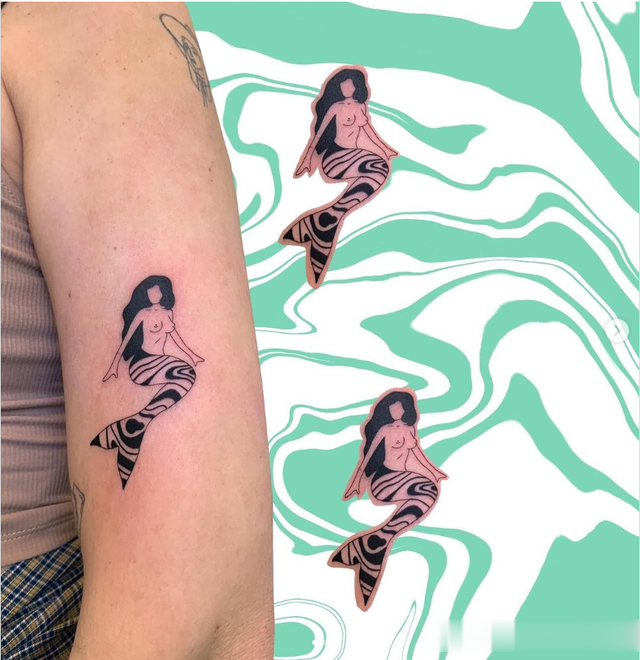 这种传统的美人鱼纹身具有深色阴影,外观引人注目。